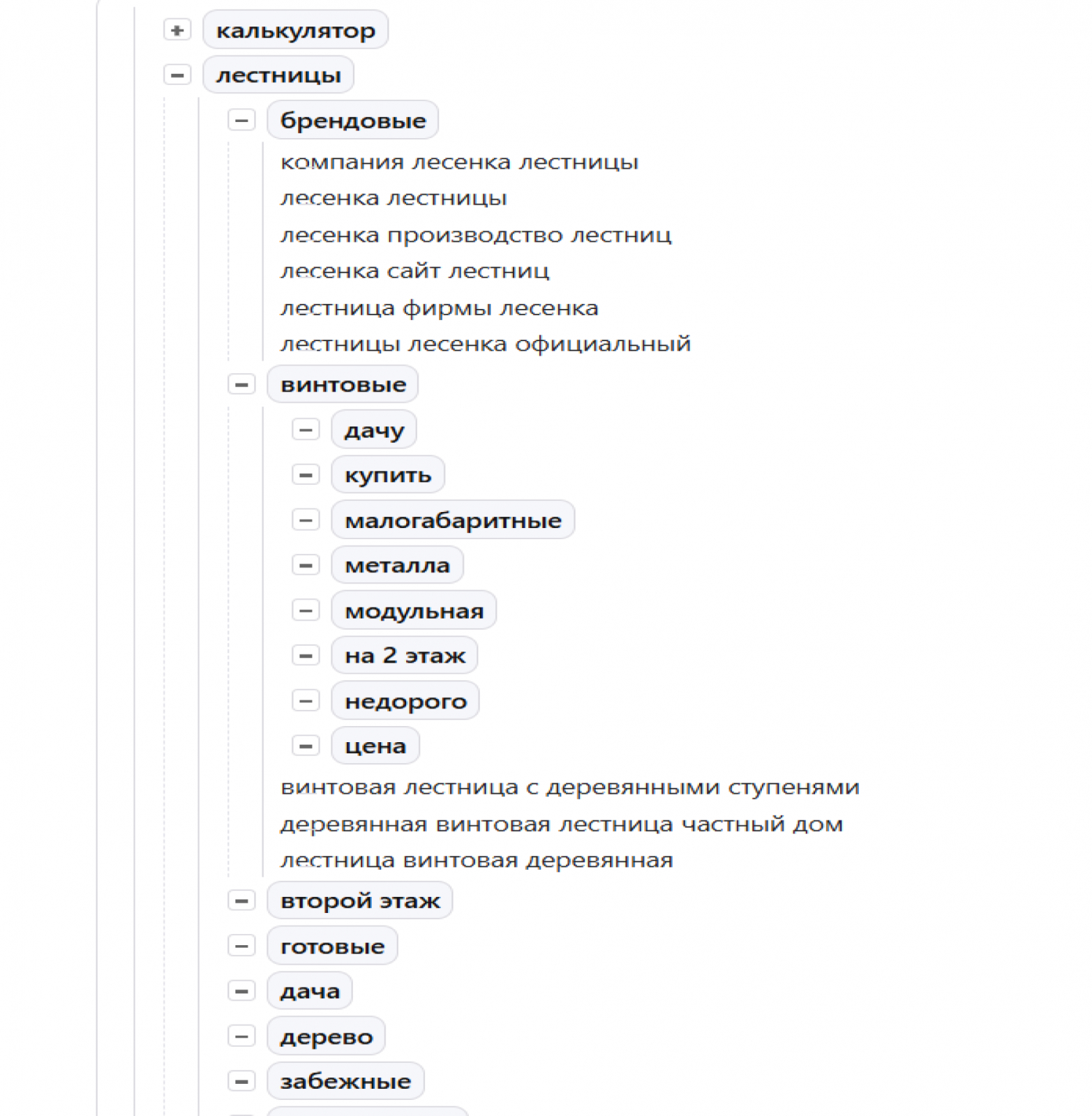 Благодаря предыдущему опыту в схожих проектах, нам удалось довольно быстро собрать и сгруппировать семантику под стратегические задачи.
