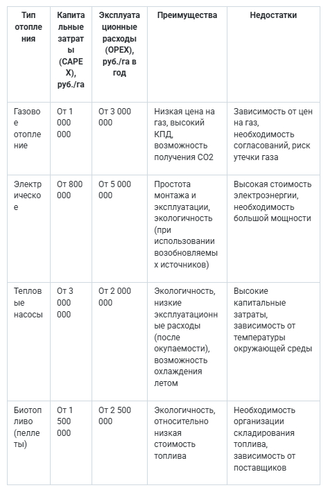 Сравним газовое и электрическое отопление для теплицы площадью 1 га в средней полосе России с потребностью в поддержании температуры +20°C зимой. Предположим, что цена на газ составляет 7 руб./м³, а тариф на электроэнергию – 5 руб./кВт*ч.