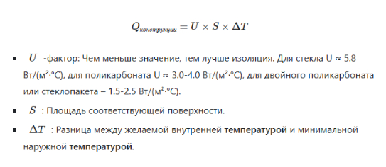 - Рассчитать теплопотери через конструкцию теплицы: Это наиболее сложная часть. Теплопотери складываются из: