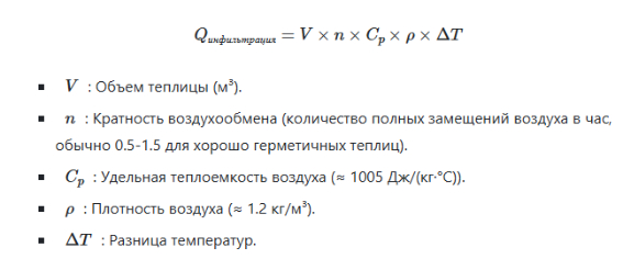 - Теплопотери на инфильтрацию (проветривание): Проникновение холодного воздуха через неплотности. Рассчитывается по объему теплицы и кратности воздухообмена:
