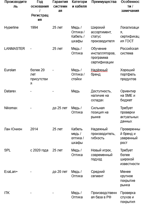 При выборе производителя СКС важно смотреть не только на цену, но на комплекс факторов: гарантийные обязательства, сертификация, наличие локального производства, ассортимент категорий кабеля, и готовность производителя поддерживать проект в долгосрочной перспективе.