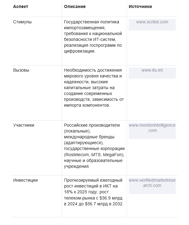 Таким образом, динамика локализации производства на российском рынке СКС — это сложный, многогранный процесс, находящийся на стадии активного развития. Он движим как внешними силами (санкции, геополитика), так и внутренними (потребность в технологическом суверенитете, государственная поддержка). На период до 2030 года можно ожидать дальнейшего усиления роли локальных производителей, особенно в массовых и государственных сегментах, в то время как международные бренды сохранят свое влияние в высокотехнологичных нишах. Успех будет зависеть от способности всех участников рынка адаптироваться, инвестировать в качество и инновации, а также от продолжения государственной поддержки этого стратегически важного направления.