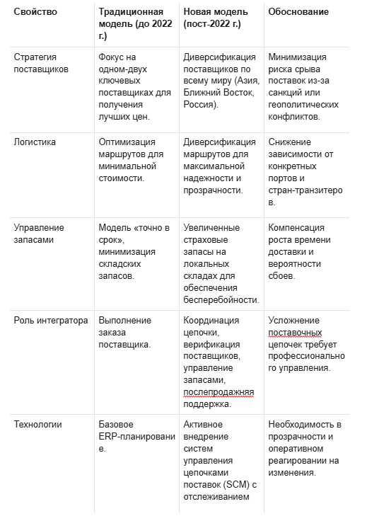 В таблице ниже представлены изменения в моделях управления цепочками поставок на российском рынке.