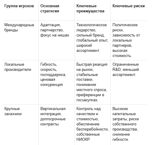 В прогнозном периоде государственный сектор останется самым стабильным и предсказуемым сегментом рынка. Конкуренция здесь будет происходить преимущественно внутри отечественного сектора. Локальные производители получат неоспоримое преимущество благодаря государственному заказу и преференциальным условиям в тендерах. Можно ожидать, что доля локальных производителей в этом сегменте достигнет и превысит 80% во всех трех сценариях. Международные бренды смогут присутствовать лишь в очень узких нишах, где требуется специфическая технология, которой нет в наличии у российских компаний, и при условии, что они смогут предложить решение через партнерскую схему.