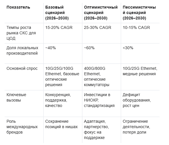 Оптимистичный сценарий ("Технологический прорыв"): В условиях активной государственной поддержки НИОКР в области ИКТ, российские компании смогут разработать и вывести на рынок собственные решения для сетей 400G/800G Ethernet, не уступающие мировым аналогам. Это приведет к резкому скачку доли локальных производителей, которые смогут занять до 60% рынка. Возникнут отечественные экосистемы, объединяющие производителей оборудования, системных интеграторов и разработчиков ПО. В этом сценарии ЦОД-сегмент станет символом технологического суверенитета России в области ИКТ.