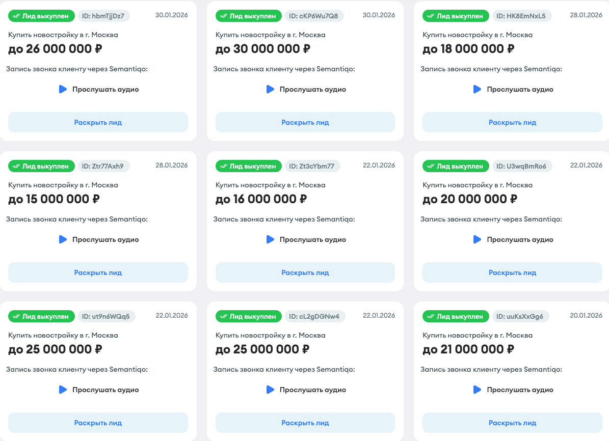Качество лидов в недвижимости определяется не источником и не количеством заявок, а глубиной первичного контакта. Агент, который умеет фильтровать входящий поток, всегда будет в более устойчивой позиции, независимо от состояния рынка. Именно поэтому мы в Semantiqo уделяем большое значение росту и развитию агента, обращая внимание на отточенность скрипта и правильной коммуникации. Ознакомиться с примерами успешных диалогов мы можете в нашей Базе знаний (доступно после регистрации).