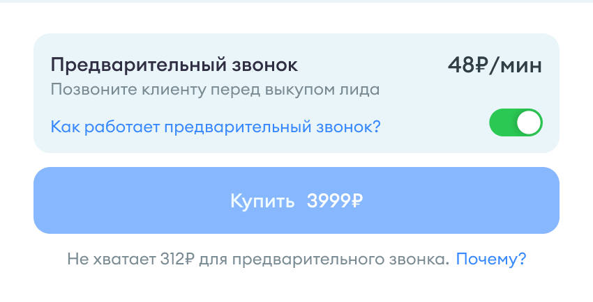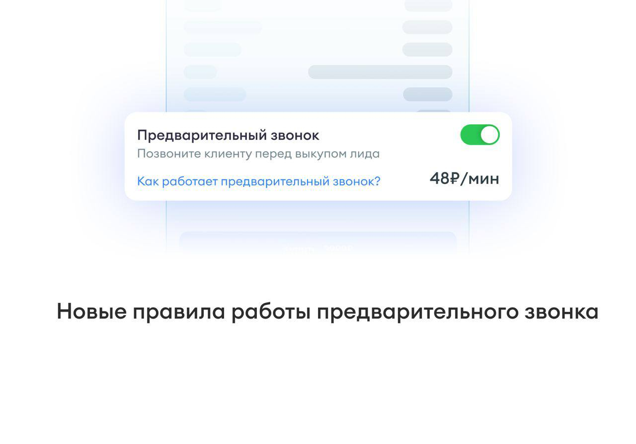 Теперь предварительный звонок работает по поминутной тарификации, а стоимость лида временно замораживается.
