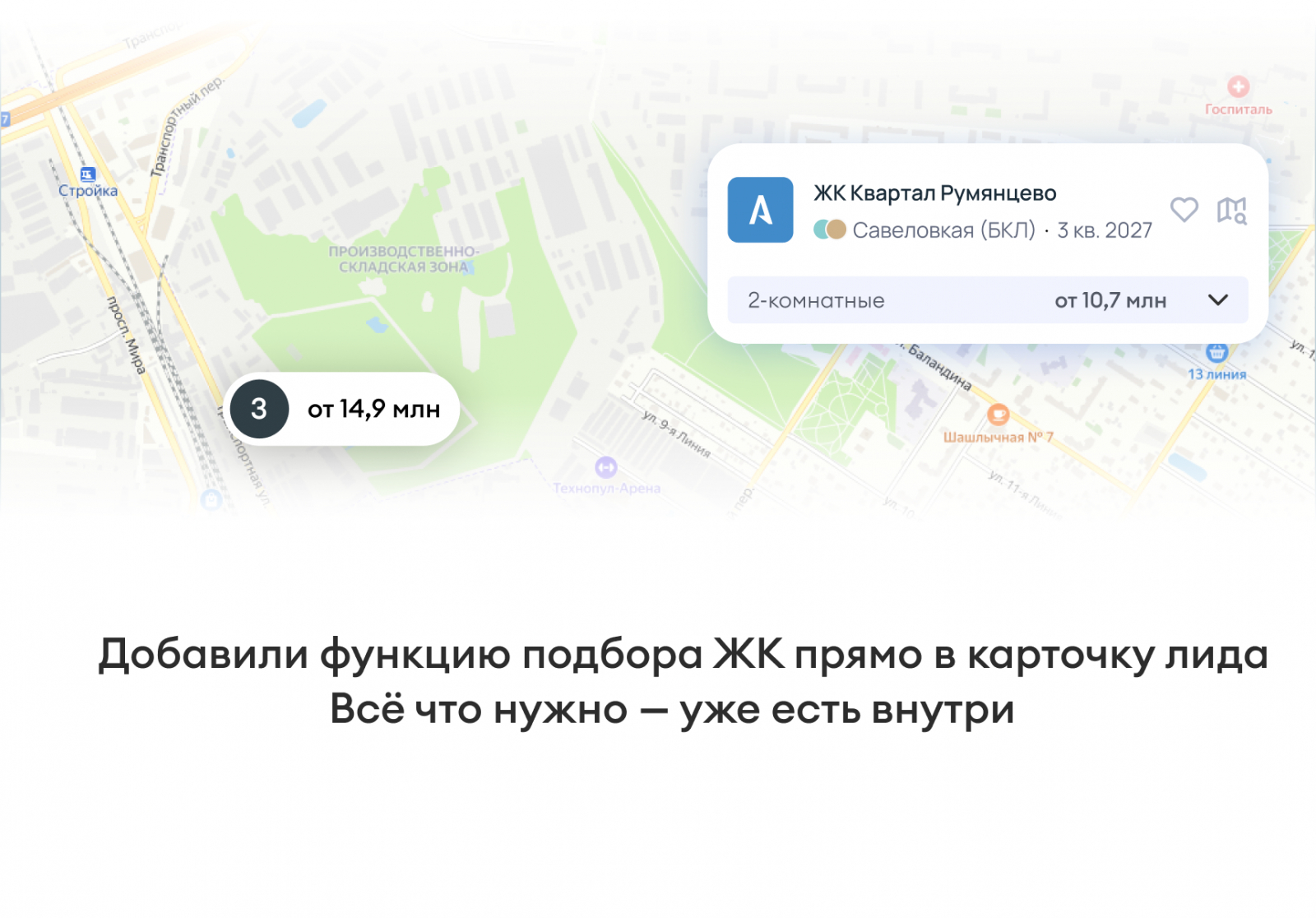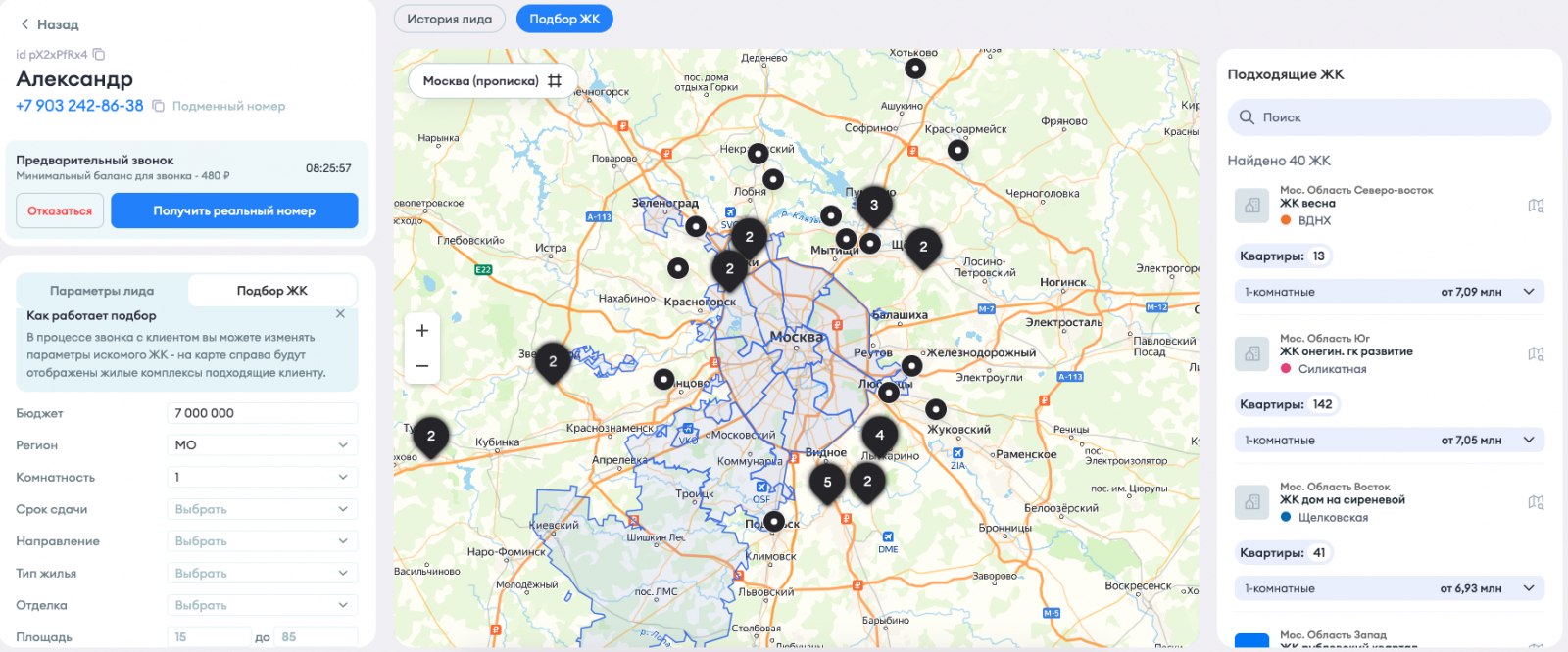 Новая функция встроена в интерфейс карточки. После заполнения базовых параметров клиента система позволяет перейти к блоку подбора жилых комплексРАб
