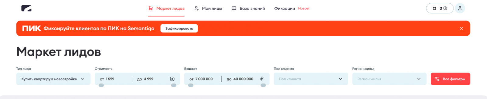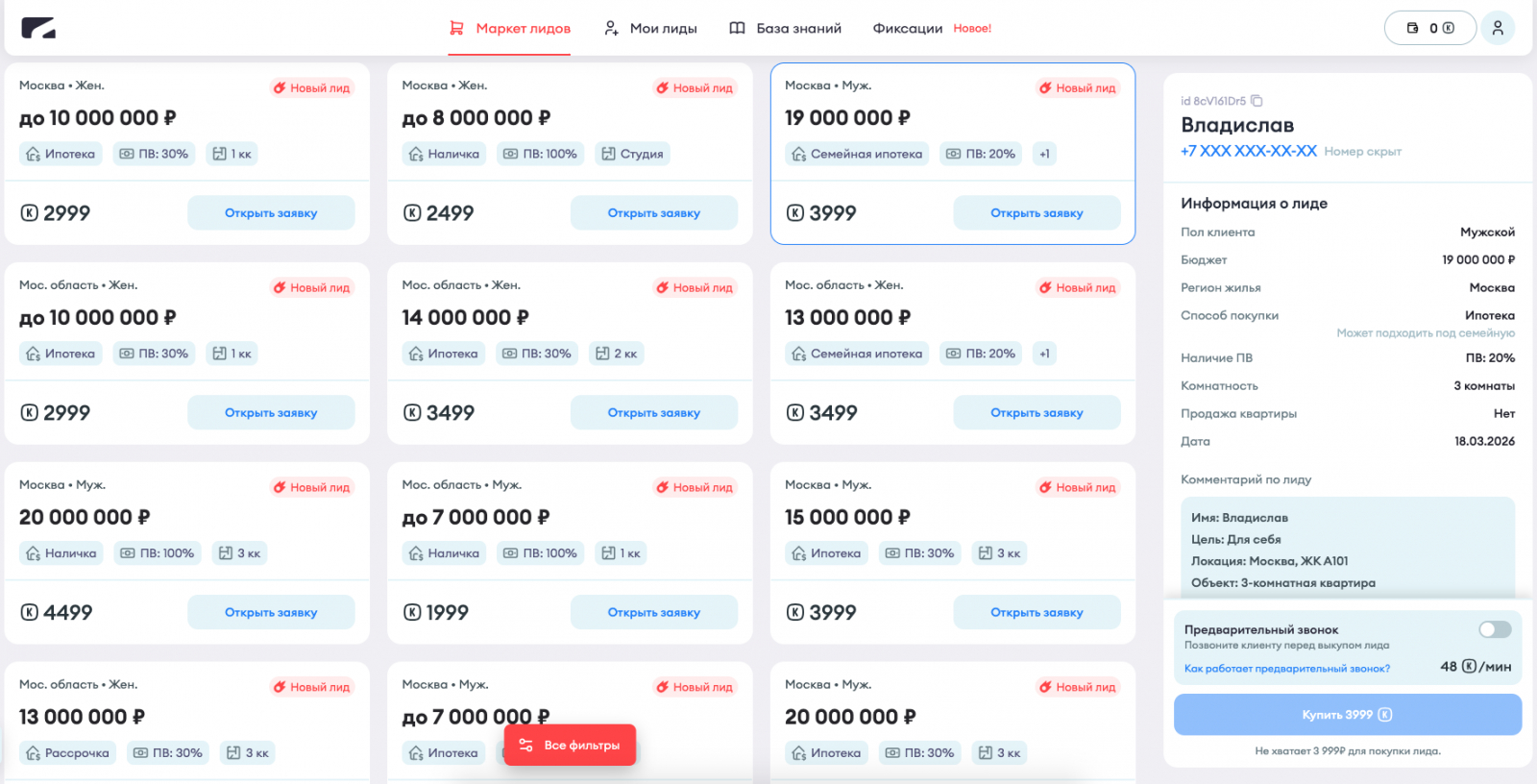 В маркете лидов Semantiqo можно выбирать клиентов с уже выявленным бюджетом и параметрами покупки. Брокеру не нужно тратить время на выяснение финансовых возможностей клиента. В интерфейсе системы он может отфильтровать поток и выкупить только те лиды, которые подходят под его объект.