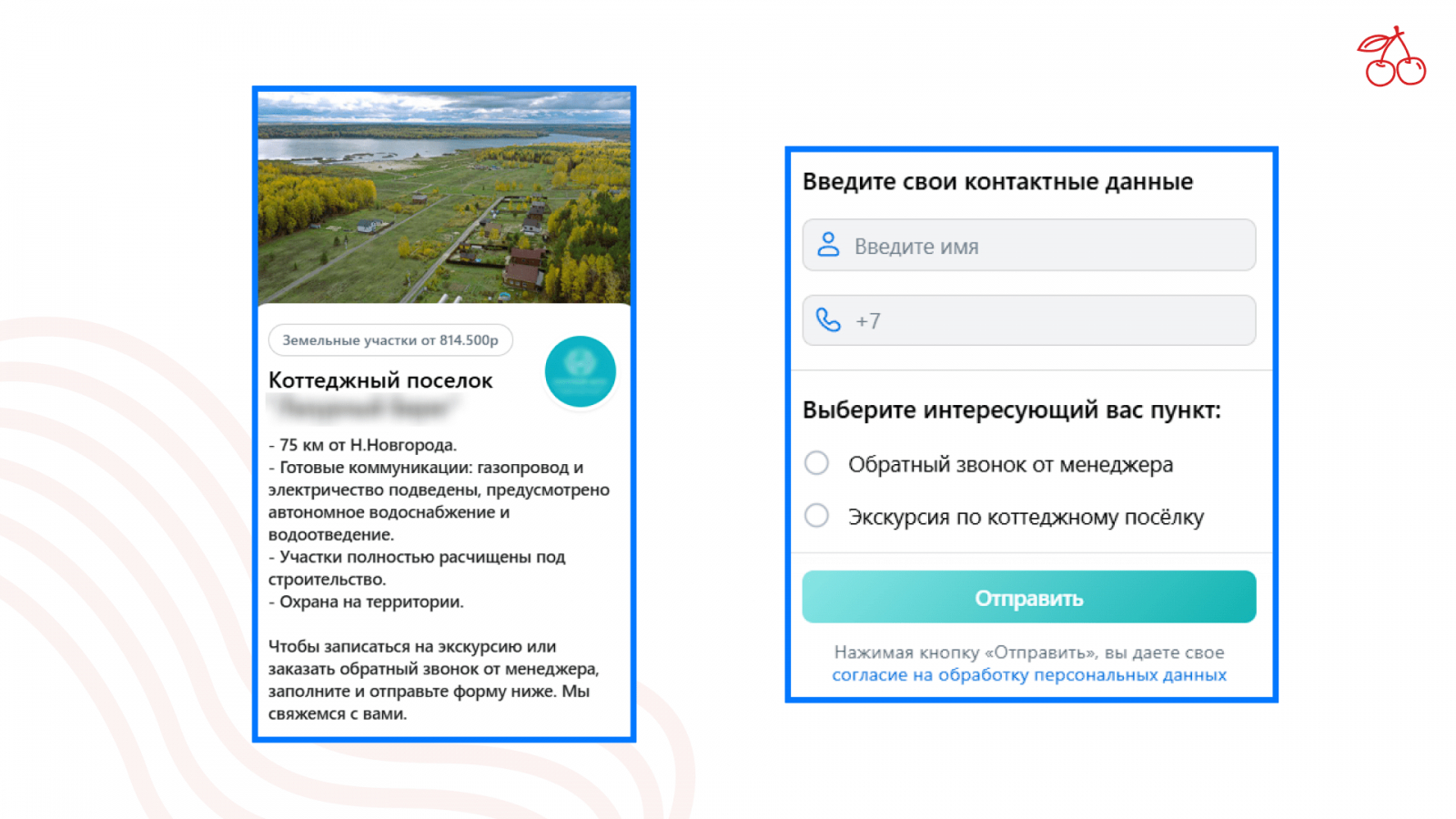 В качестве призыва мы используем расчет стоимости участка. Это отсеивает интересантов, но привлекает именно тех, кто рассматривает покупку участка в ближайшие месяцы.