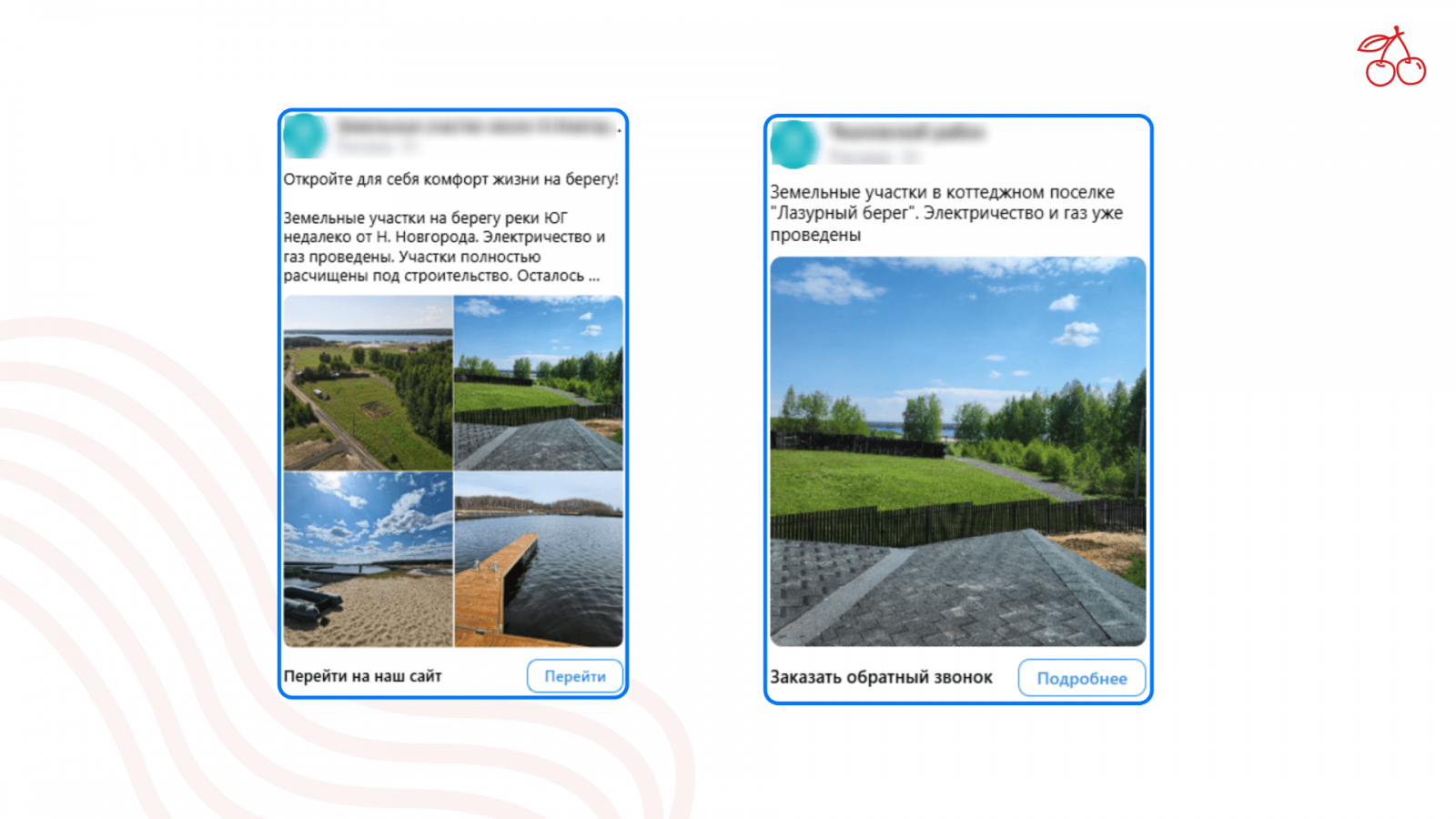 Для креативов мы использовали обычные фотографии участков. Также мы тестировали профессиональные фото объектов, но они приносят меньше кликов и заявок — гораздо лучше отрабатывают объявления с «живыми» простыми фотографиями местности.