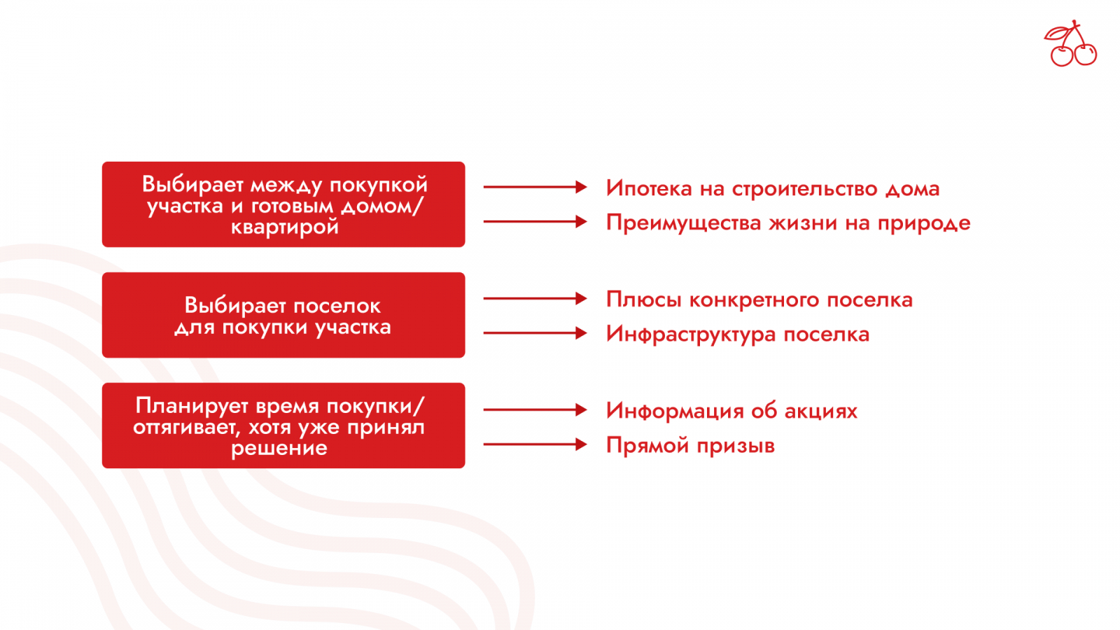Работа с исследованием аудитории помогает команде «Вишни» привлекать неочевидные клиентские сегменты, не замеченные конкурентами. Например, в Нижнем Новгороде среди аудитории, которая может себе позволить недвижимость, популярен яхтинг. Мы протестировали эту гипотезу и получили всплеск заявок после запуска рекламы на яхтсменов. Потому что рядом с участками есть пирс, где любители водных видов спорта могут организовать себе занятие по душе.