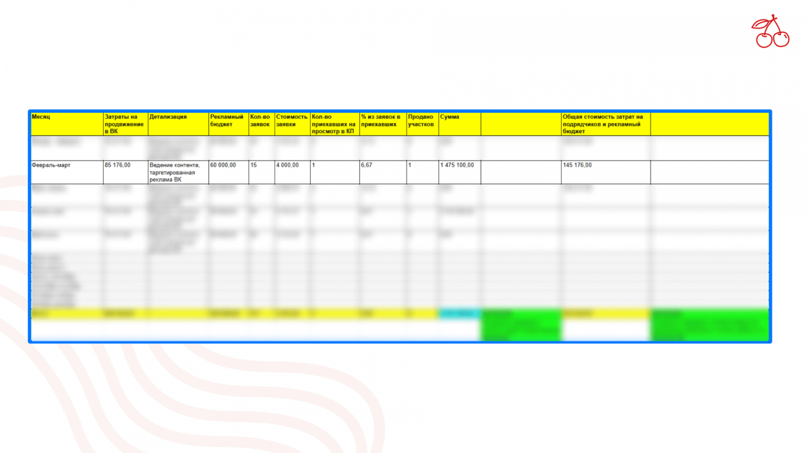 Поэтому «Вишня» сводит данные для заказчиков не только о кликах и стоимости лидов — мы включаем в отчеты просмотры участков и продажи. Также руководитель проекта включает туда стоимость работ и считает, сколько заказчик затрачивает на продвижение. Так клиент получает всю аналитику: от клика до продажи.