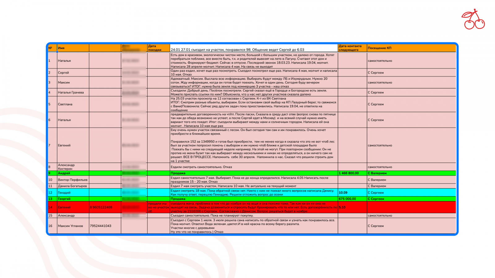 В этом проекте информацию о продажах нам предоставляет менеджер ОП агентства «Вишня», который квалифицирует и обрабатывает заявки от потенциальных покупателей. Специалист не только собирает количественные данные о сделках, но и расписывает ответы клиентов, на основе которых мы улучшаем РК.