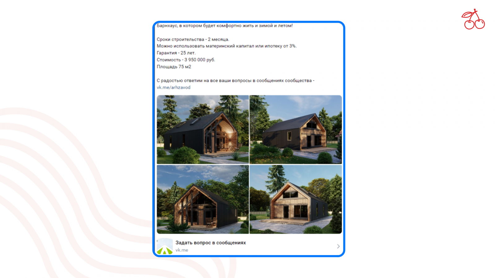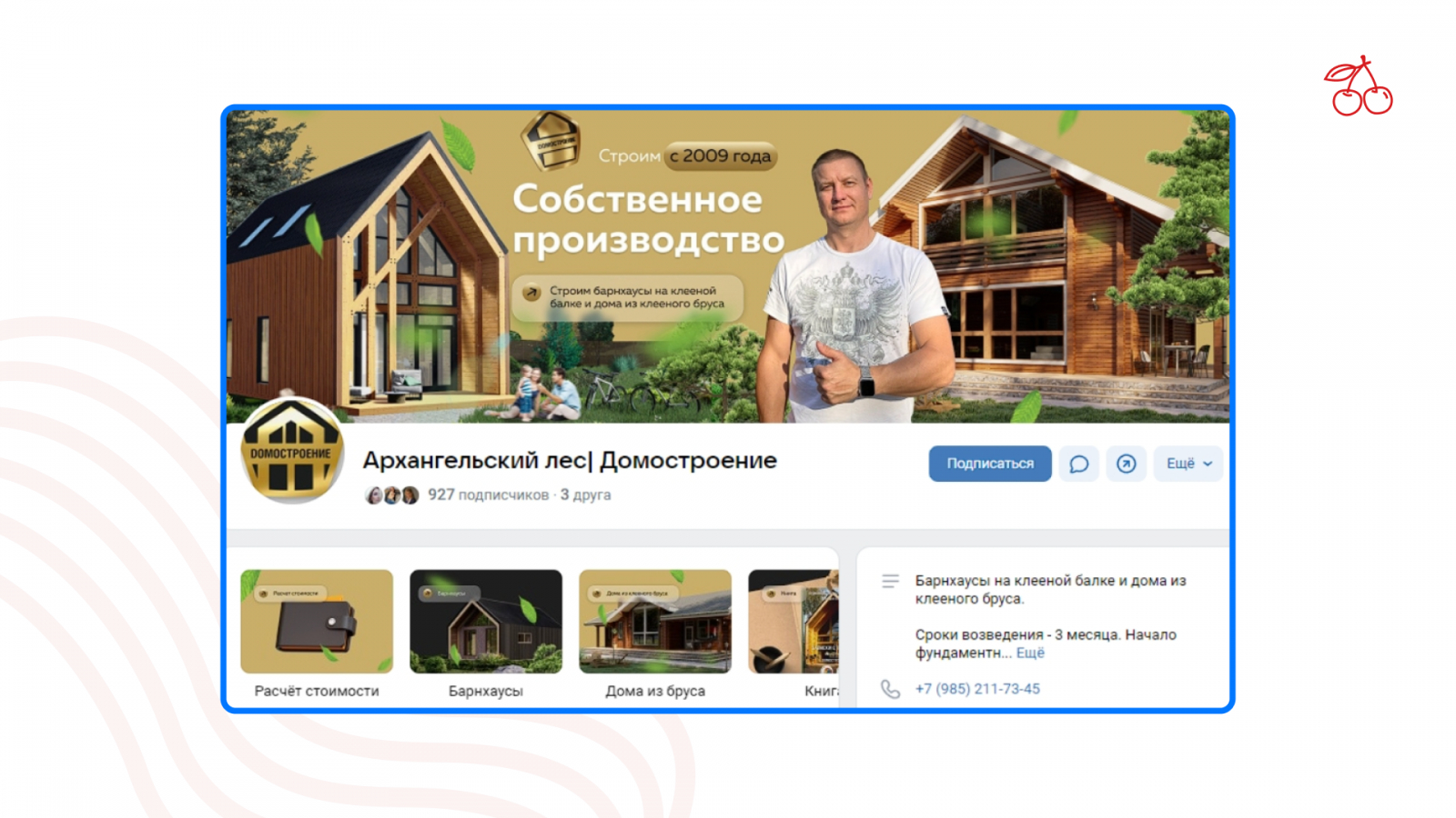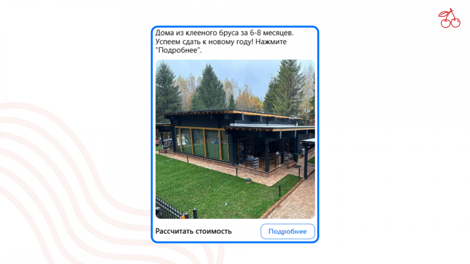 Например, один из наших клиентов — строительная компания из Архангельской области. Строит и продает дома из клееного бруса. Чтобы привлекать целевые лиды из ВКонтакте, мы использовали лид-форму с: