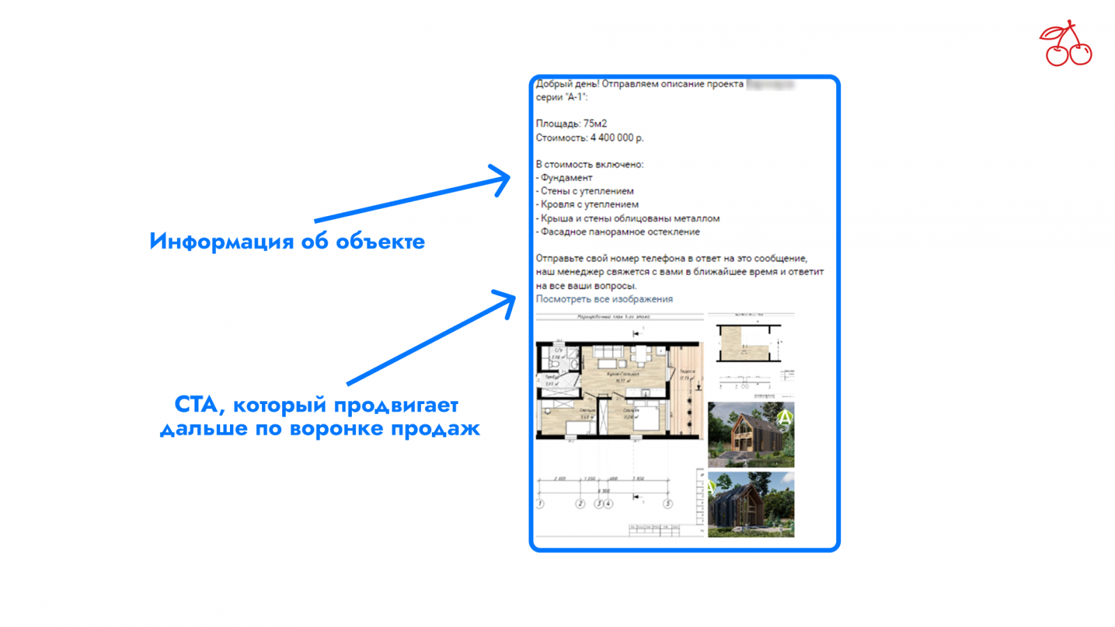 С помощью бота можно не просто автоматически обрабатывать входящие заявки, но и собирать в нем базу контактов потенциальных покупателей. Для этого можно также вести человека в сообщения, где его уже будет ждать приветственное сообщение от бота с информацией об объекте, которым интересовался клиент.