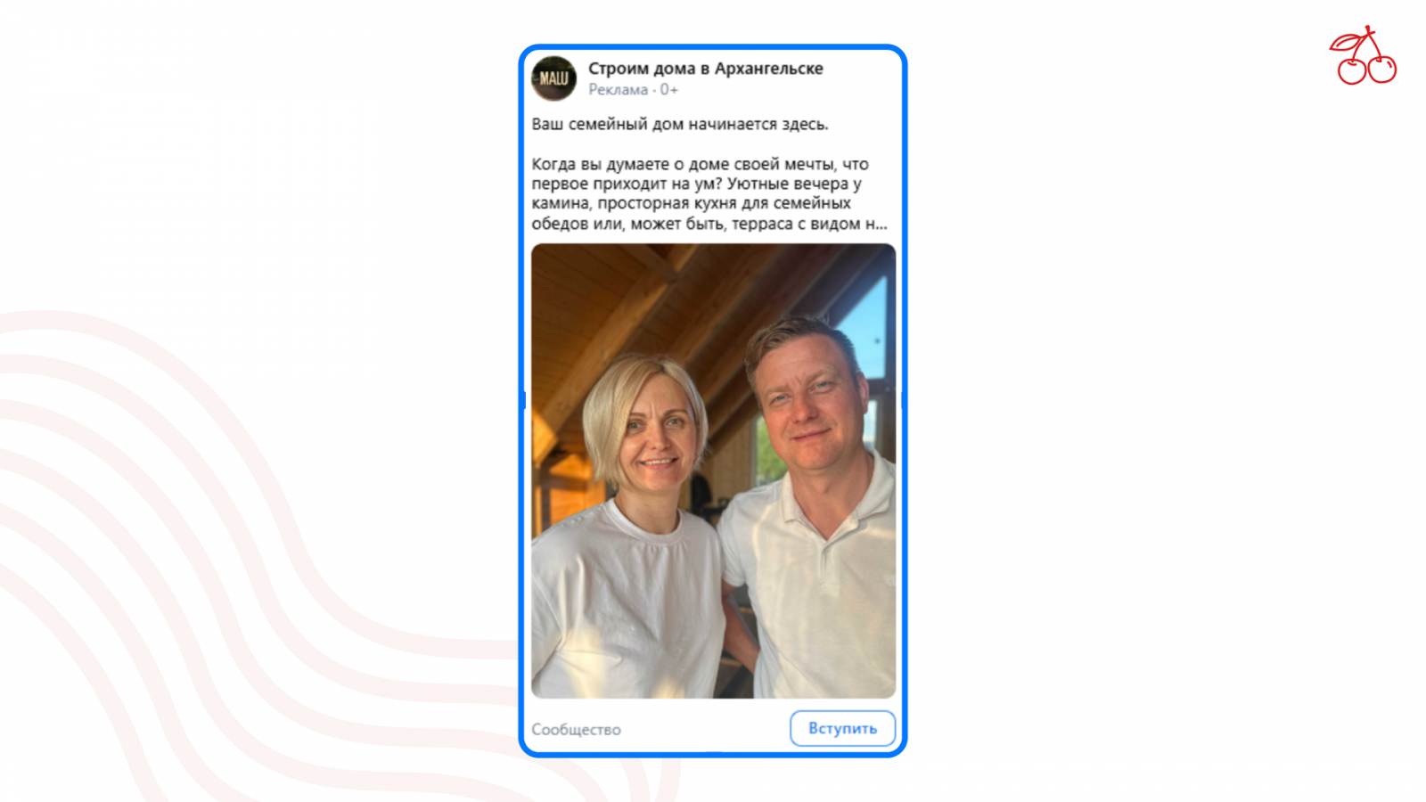 Также живые фото помогают привлекать подписчиков в сообщество застройщика. Например, фото основателей строительной фирмы принесло 336 подписчиков по 31 рублю.