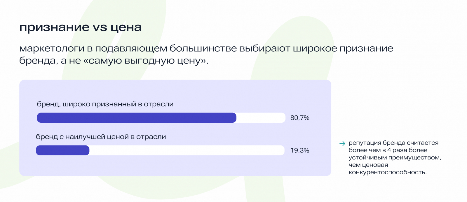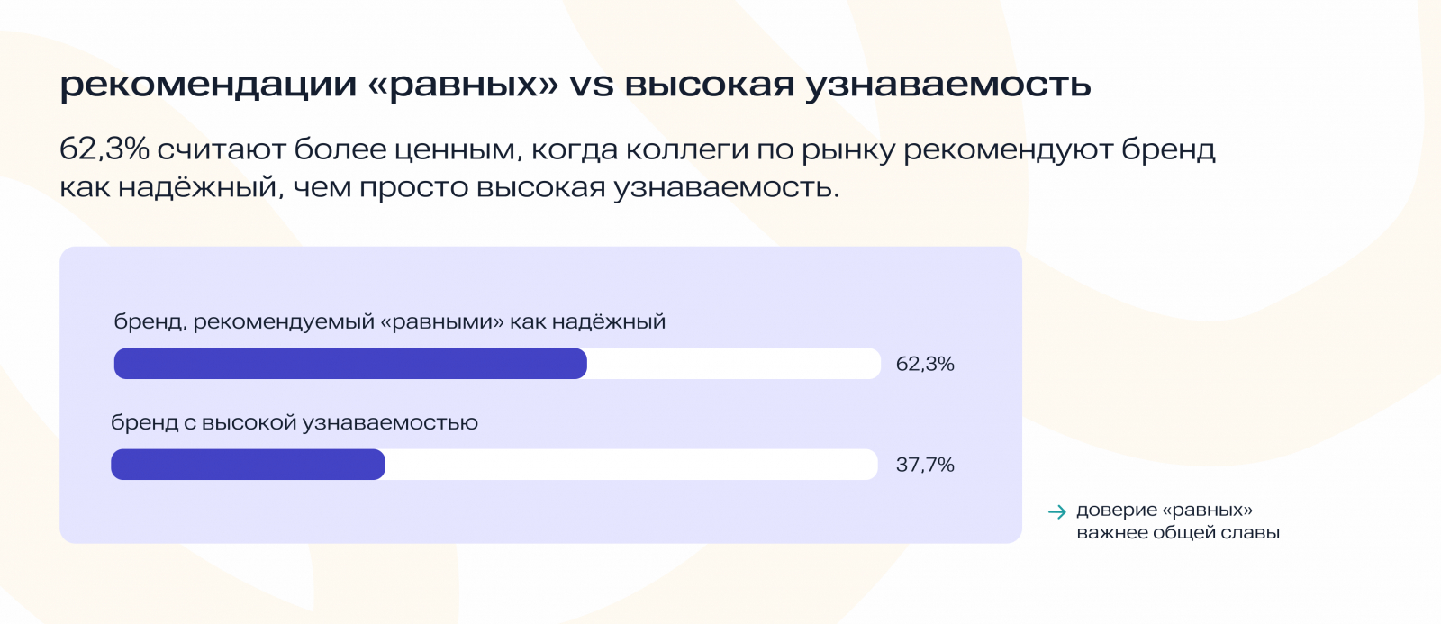 Чтобы понять, какие сигналы реально усиливают доверие, сопоставили знакомые атрибуты бренда: отзывы клиентов, рекомендации коллег по рынку, узнаваемость, цену и продуктовые особенности. В свободной оценке, где не нужно выбирать один-единственный пункт, выше других стабильно выходят социальные доказательства. Видимость и перечень функций помогают, но без живых рекомендаций и кейсов их влияние заметно слабее.