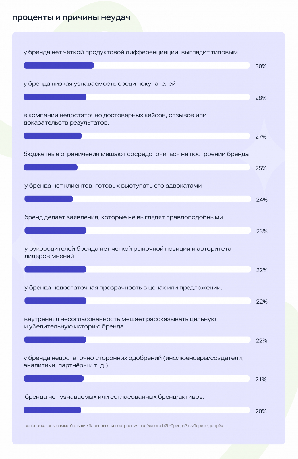 Барьеры обычно идут «пакетом»: не хватает узнаваемости и отличимости, мало проверяемых кейсов и отзывов. Часто добавляются: ограниченный бренд-бюджет, нет клиентов-адвокатов*, заявления выглядят неправдоподобно, у топ-менеджмента слабая позиция лидеров мнений, непрозрачные цены и разъезжающийся месседж внутри команды. Плюс дефицит сторонних одобрений (аналитики, партнёры, лидеры мнений) и неузнаваемые бренд-активы, и в общей сумме доверие проседает.