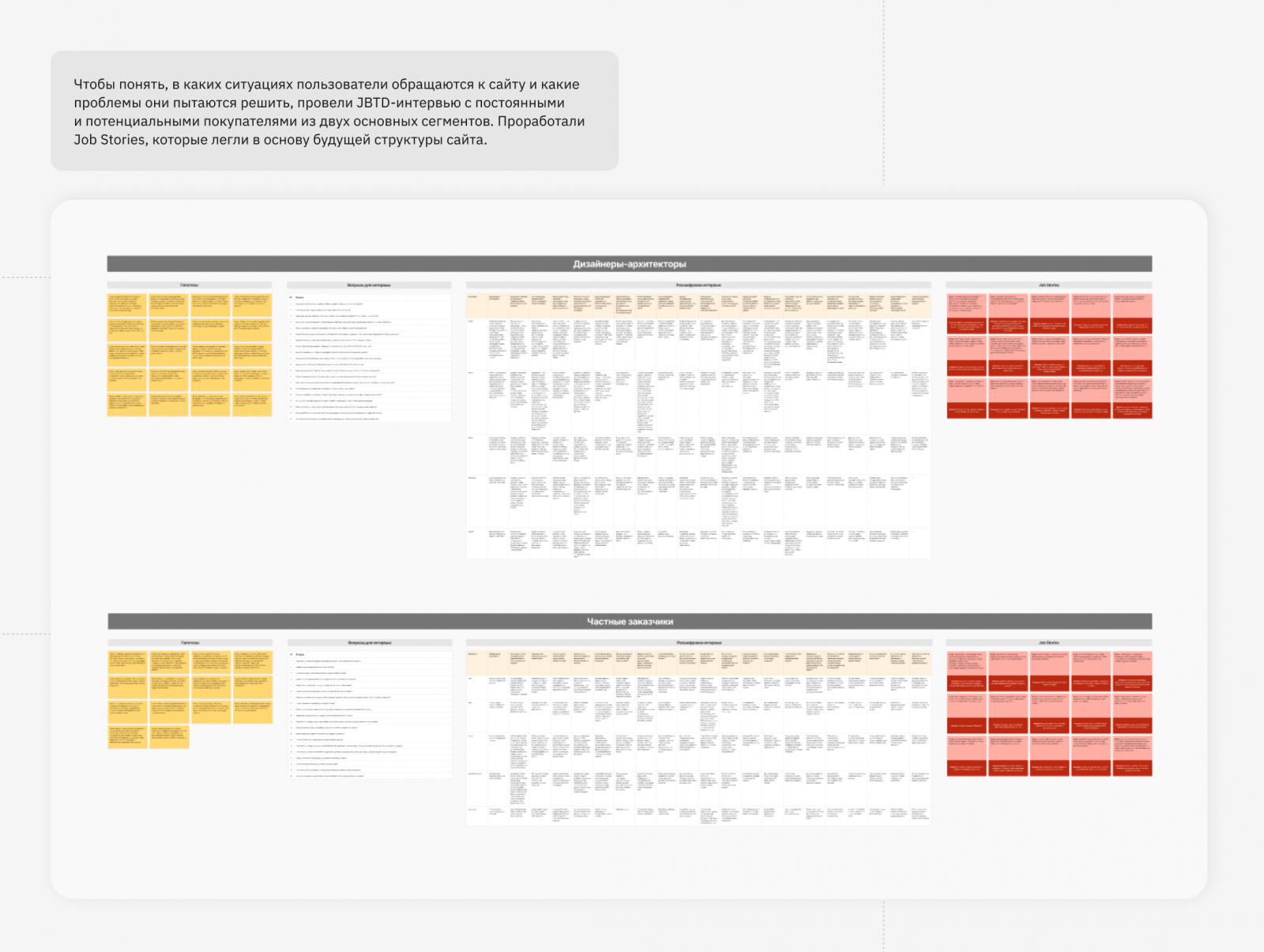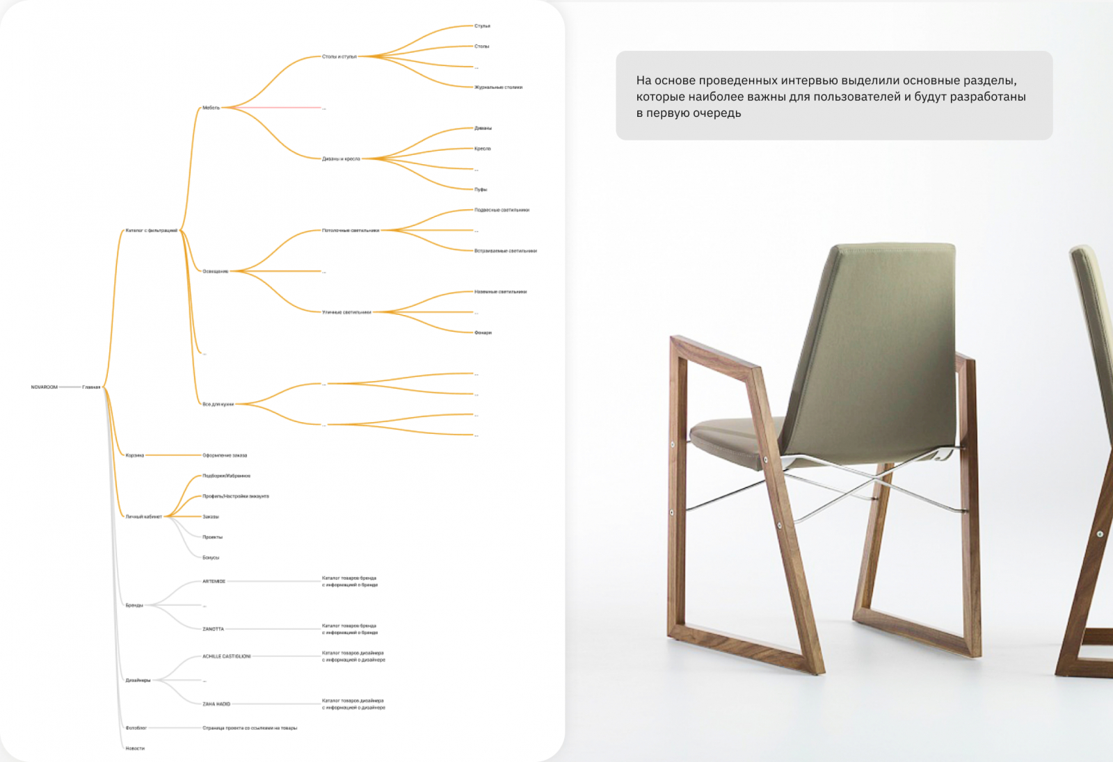 Для того чтобы точно понять мотивы и потребности этих групп мы провели интервью с клиентами Novaroom, а также с дизайнерами и частными заказчиками, которые за последние полгода покупали мебель онлайн.