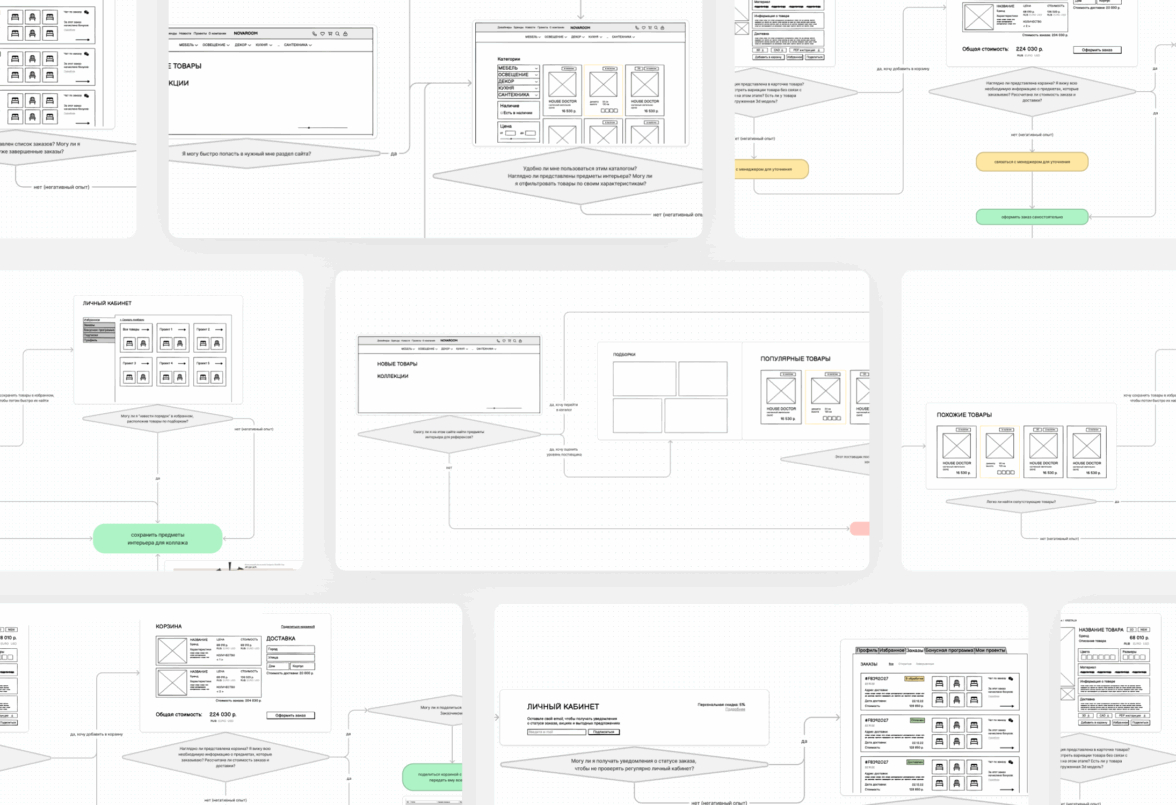 Одним из ключевых этапов проектирования стал анализ сценариев пути пользователя, позволивший нам выстроить структуру и взаимодействие с сайтом таким образом, чтобы он был удобен для обеих целевых групп — ведь путь дизайнера интерьеров и путь частного заказчика существенно различаются.