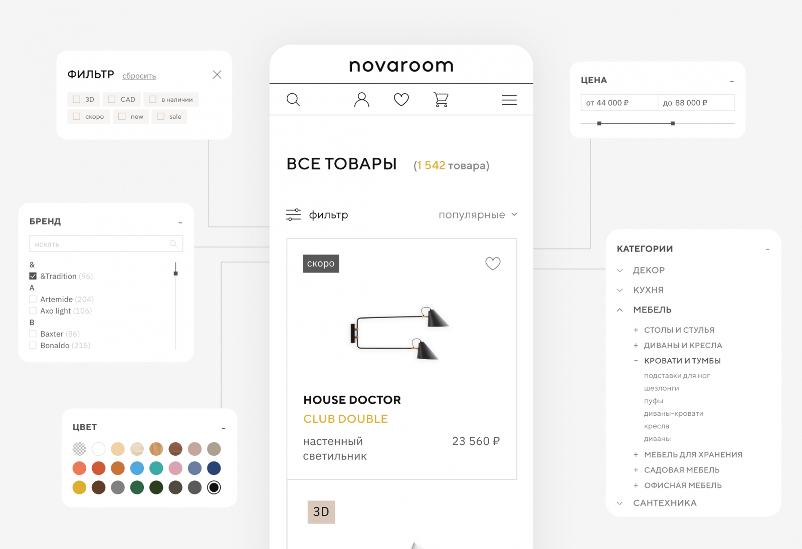 Презапустили Novaroom как инструмент для двух аудиторий — дизайнеров и частных покупателей. С помощью JTBD расставили приоритеты: вместо дорогого 3D-конструктора сделали быстрые вариации цвета, «в наличии» и умную фильтрацию.
