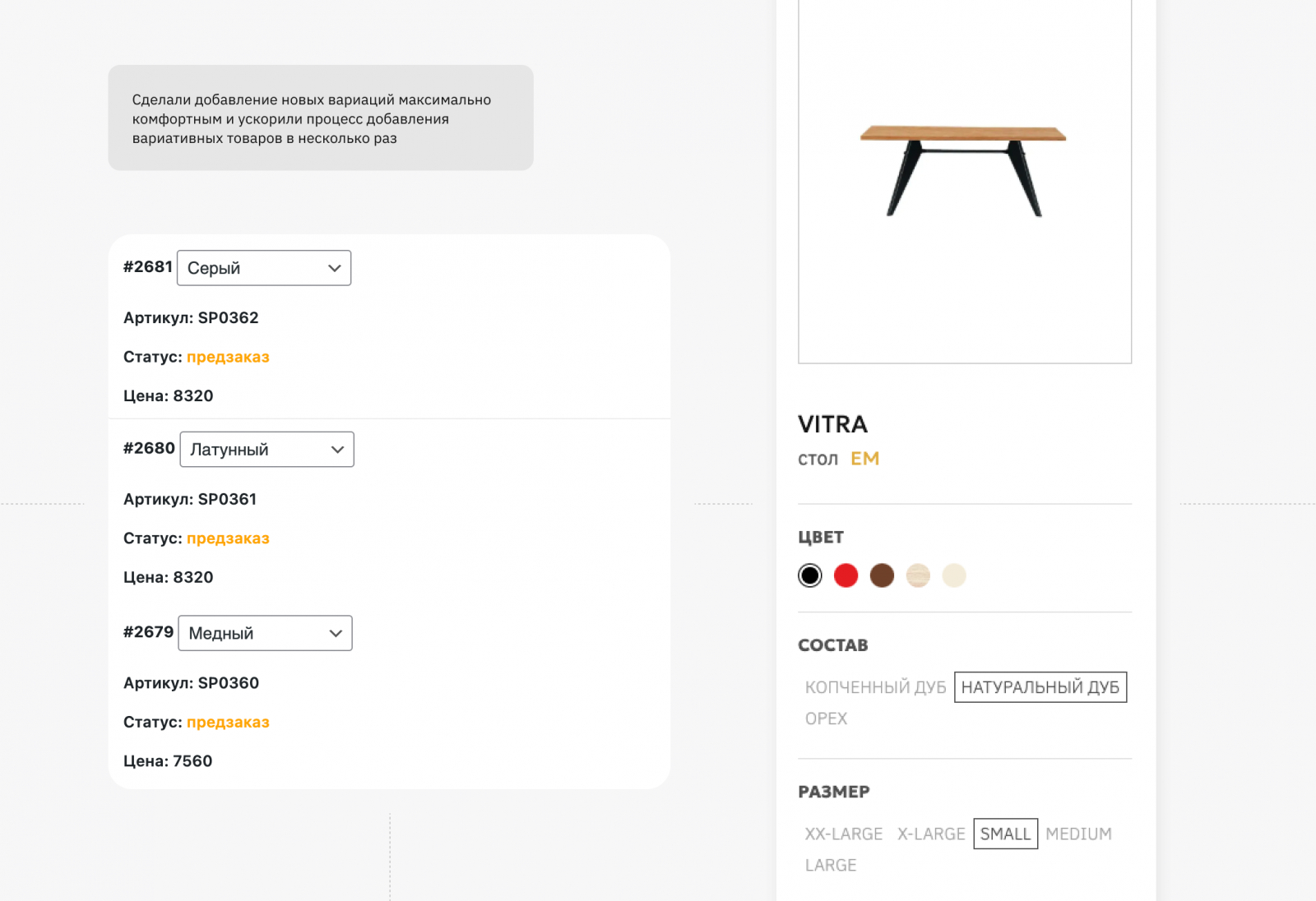 Мы проработали административную панель так, чтобы для менеджеров сайта добавление новых вариаций было максимально комфортным — вся информация хранится в основном товаре, а для вариации достаточно только указать ту характеристику, которая отличается.