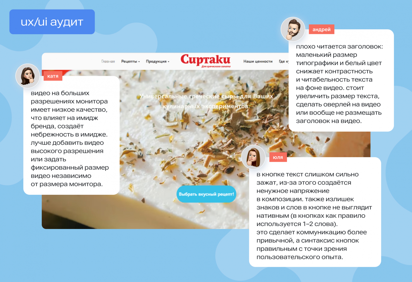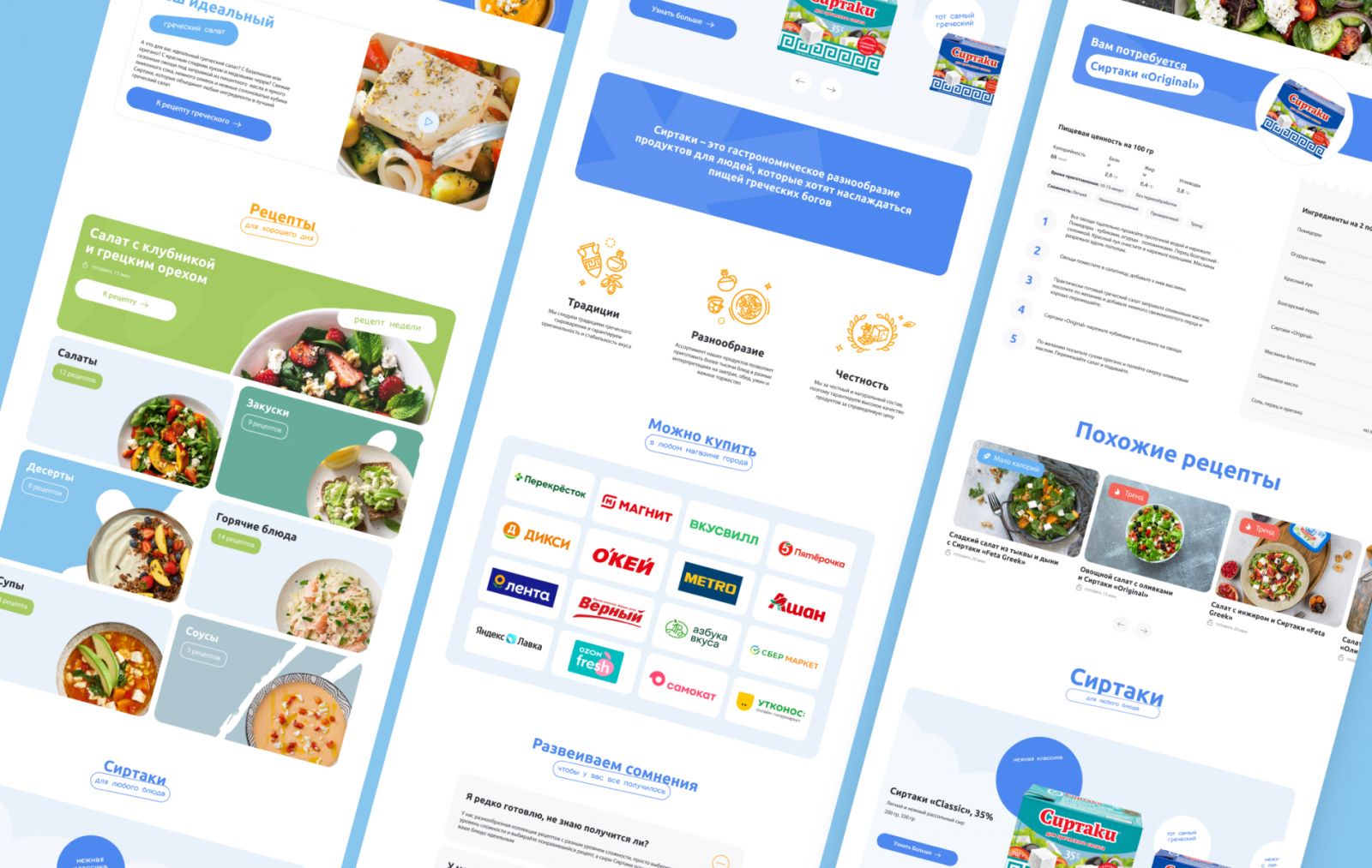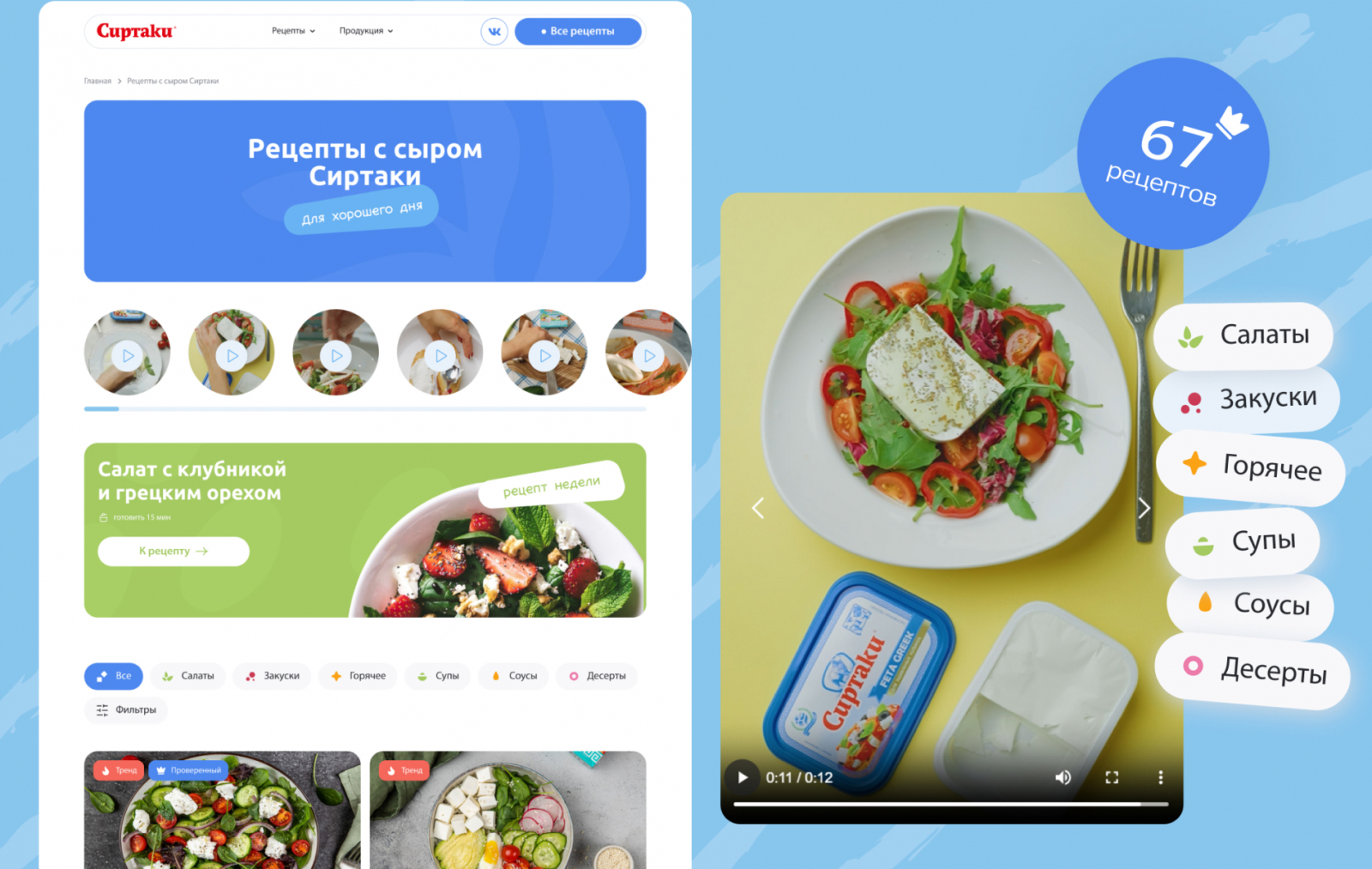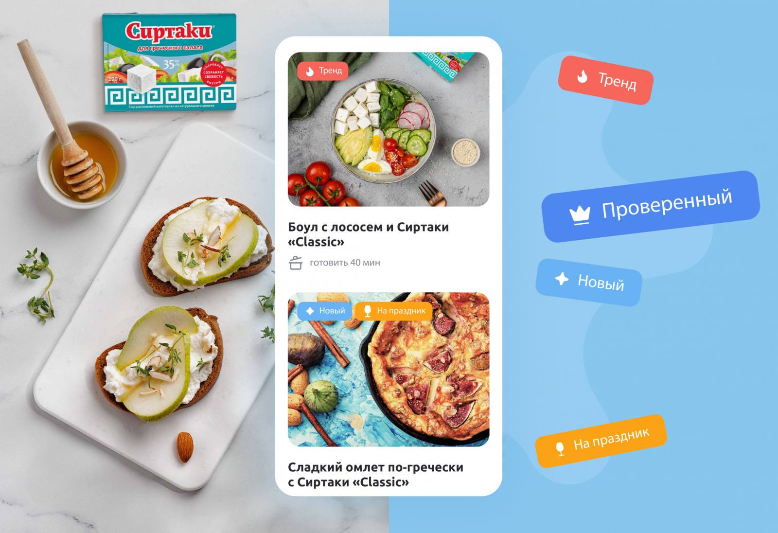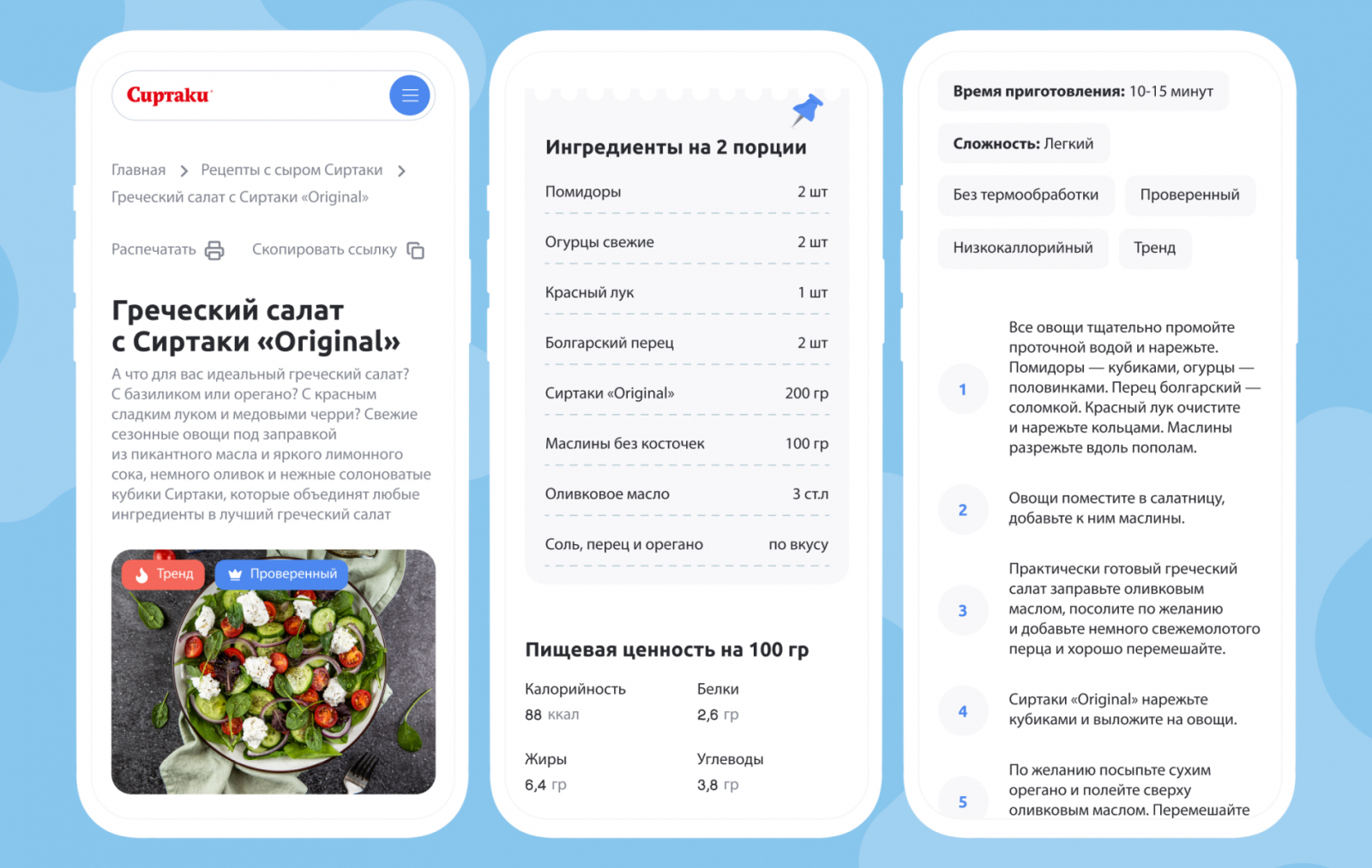 Каждый рецепт создавали с нуля. Изучали аналогичные рецепты, анализировали отзывы, подбирали лучшие комбинации ингредиентов и дополняли их ключевым героем — греческим сыром «Сиртаки». Дополнительно добавили информацию о КБЖУ, что важно для пользователей, которые следят за питанием.