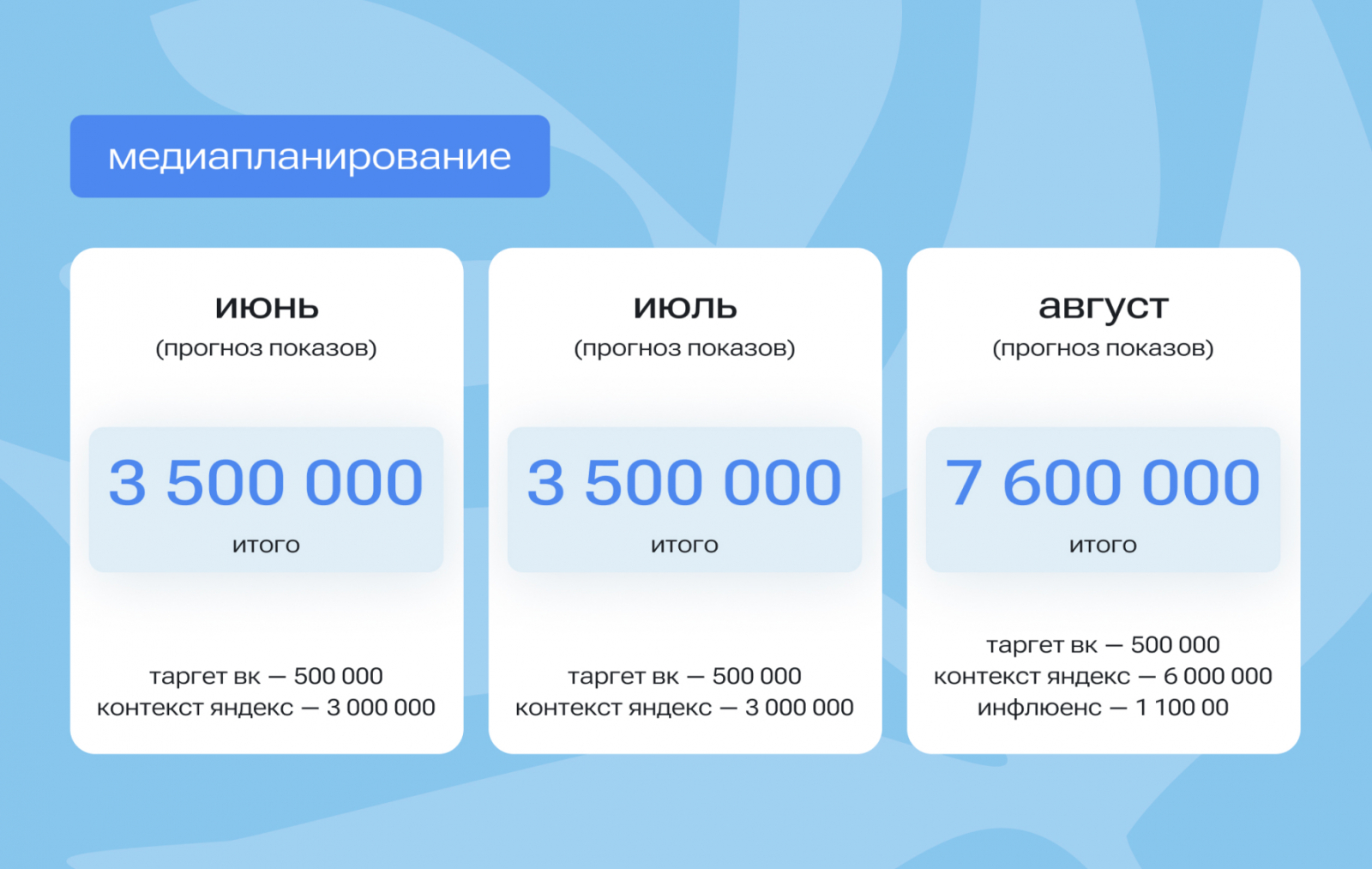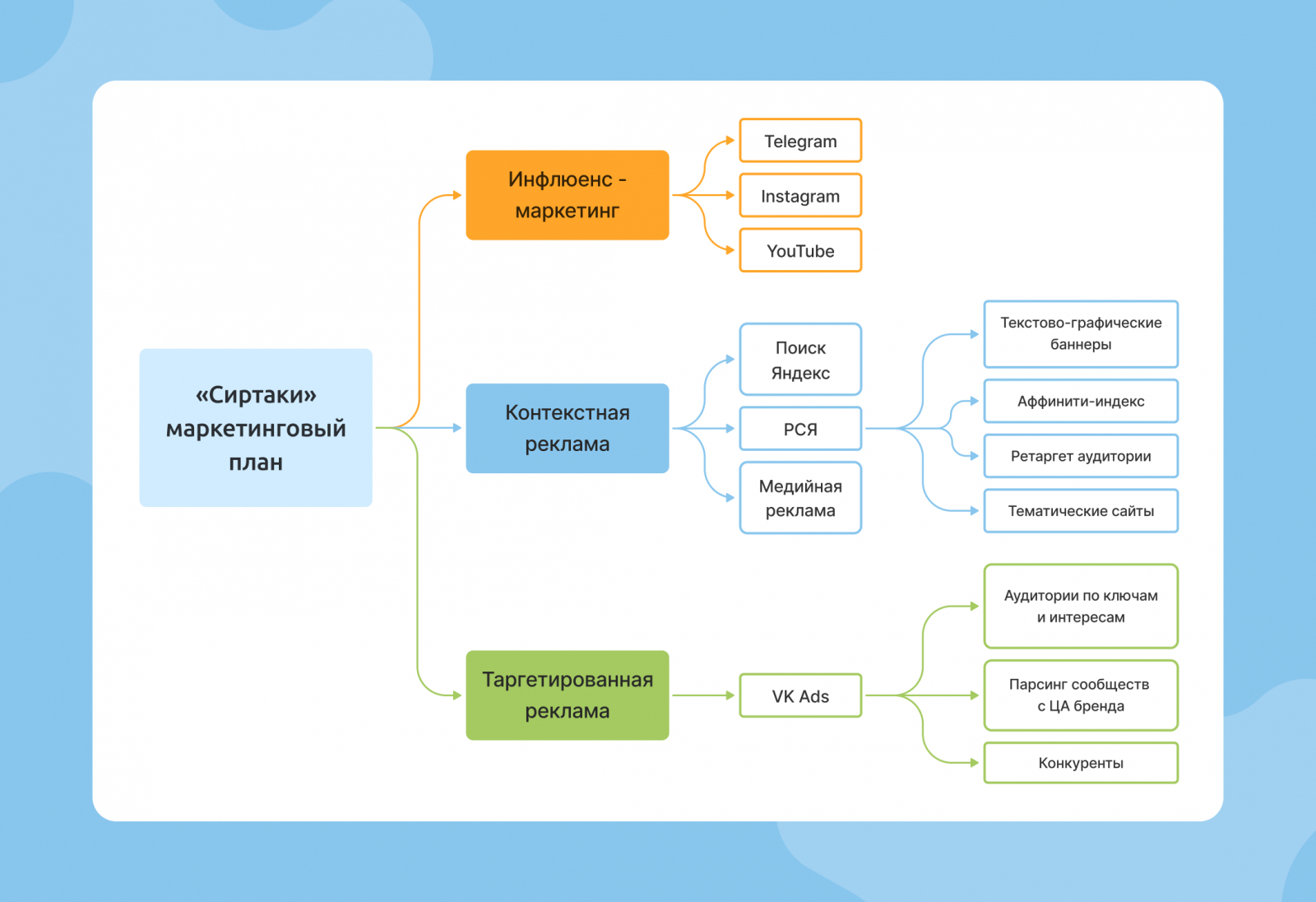 Вместе с заказчиком утвердили бюджет кампании и распределили его на три ключевых направления: контекстная реклама, таргетинг в соцсетях и инфлюенс-маркетинг.