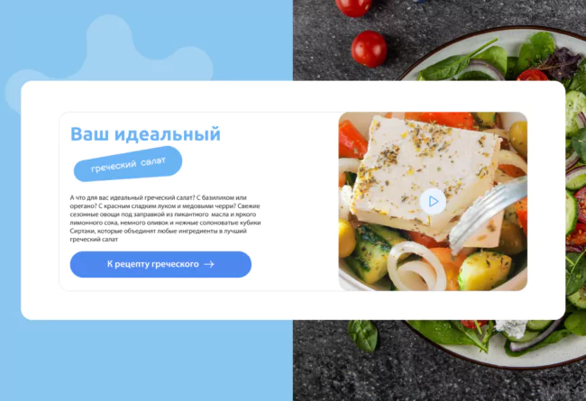 Особое внимание уделили проработке рецептов: собрали базу, опираясь на частые поисковые запросы и интересы аудитории. Помимо салатов появились десерты, горячие блюда и пиццы — многообразие позволяет привлечь все сегменты аудитории и максимально их заинтересовать. На момент запуска было 67 рецептов, сейчас их ещё больше.