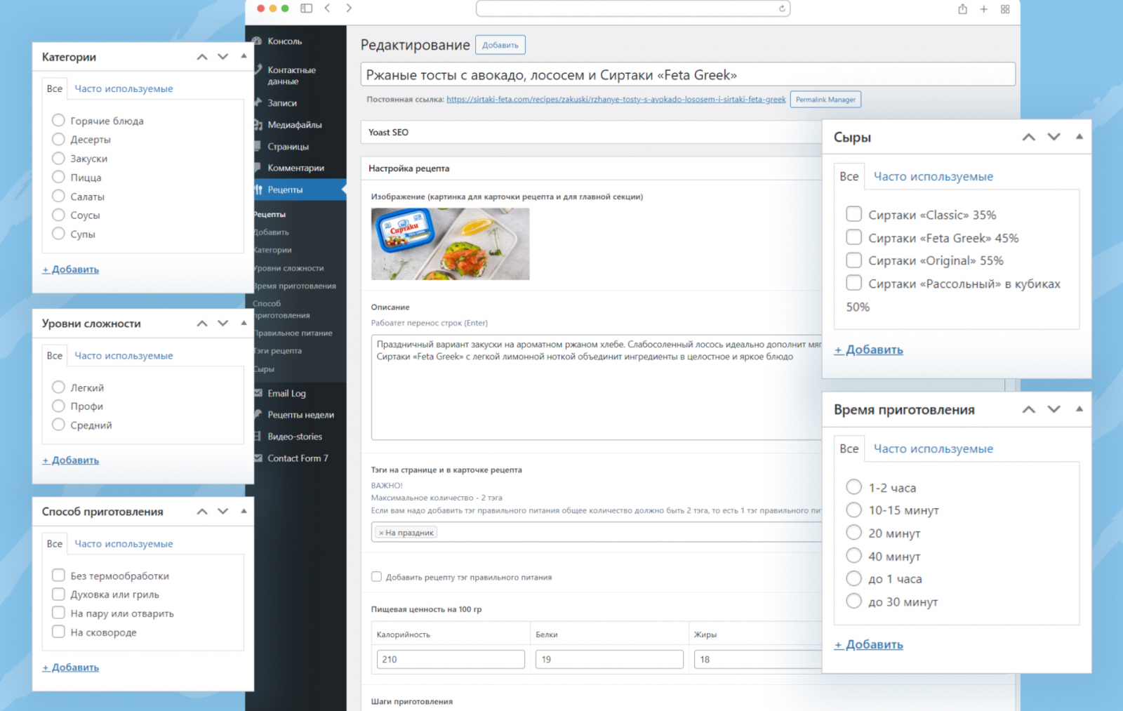 Гибко организовали административную панель — для удобства клиента вывели в отдельные пункты меню рецепты, подборки недели и сторис. При редактировании страниц в админке добавили и другие характеристики — время приготовления и тип сыра, который используется в рецепте.