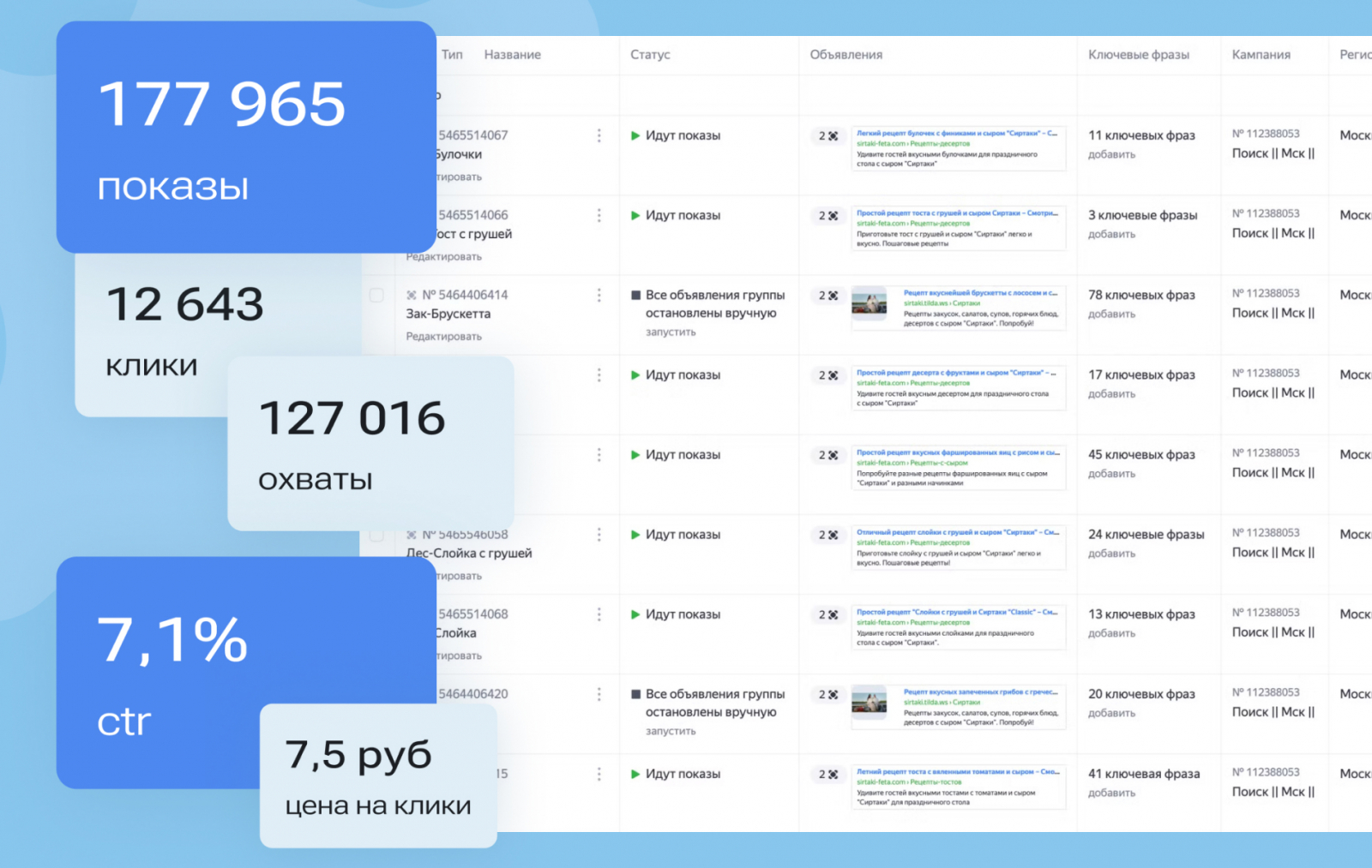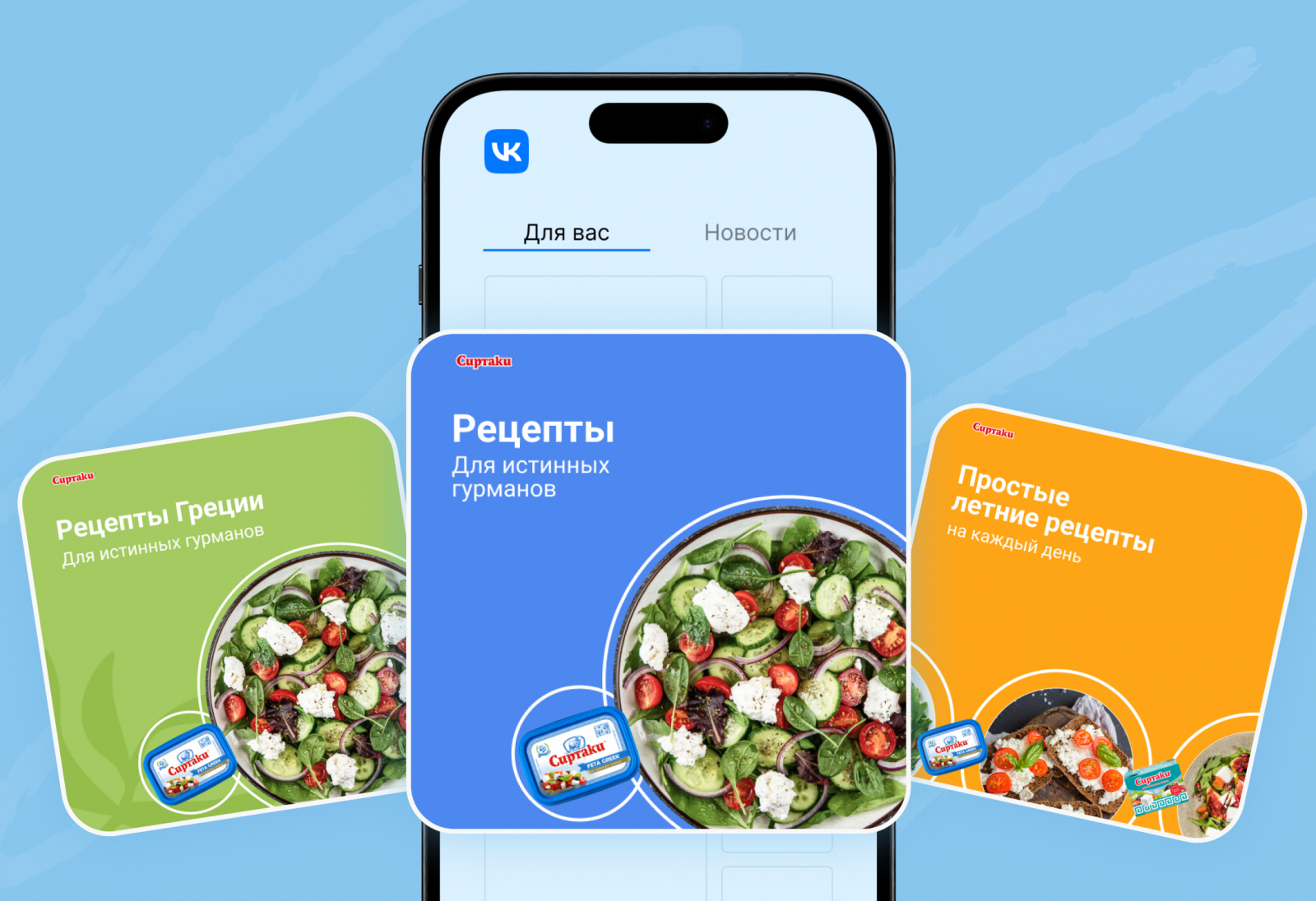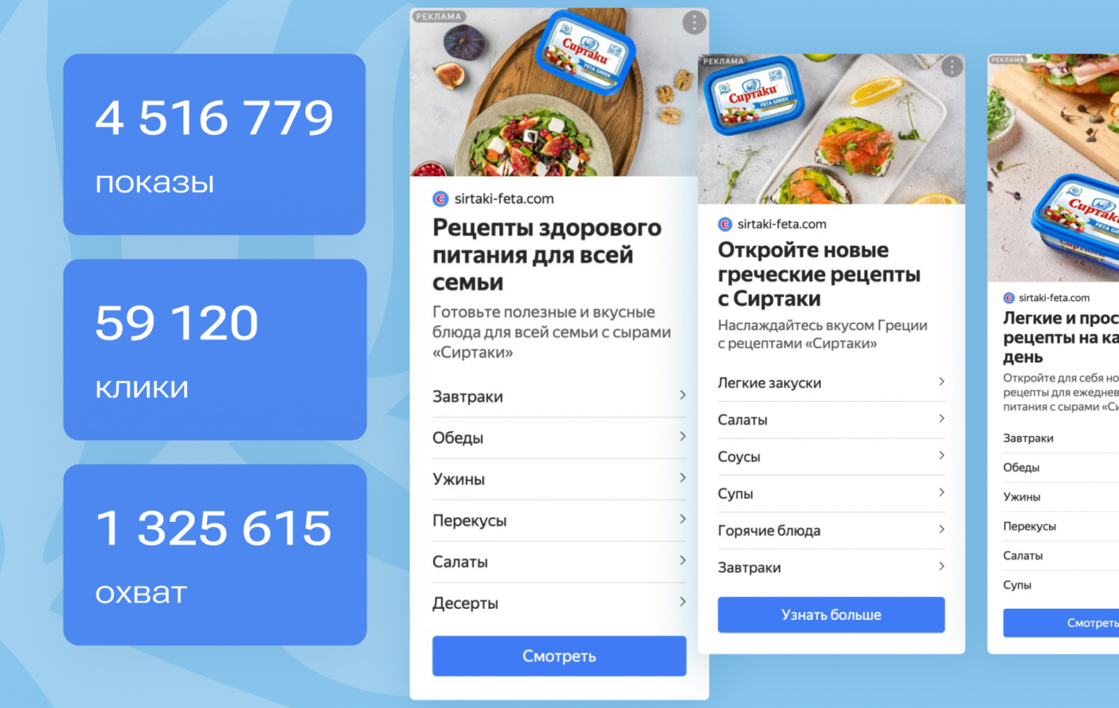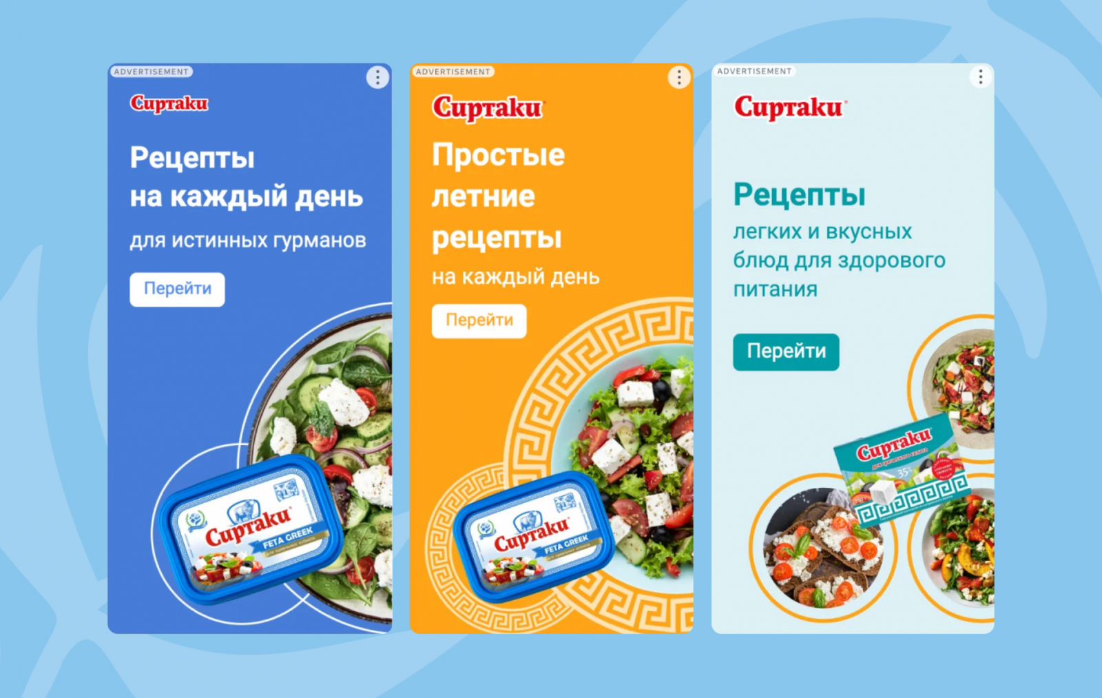 Главная цель кампании — напомнить пользователям о бренде «Сиртаки». Для этого мы использовали медийную рекламу, объявления в РСЯ и на Поиске Яндекса, а также таргетированную рекламу в VK Ads. Основной упор сделали на аудиторию, увлеченную кулинарией: рекламу показывали пользователям, состоящим в кулинарных сообществах и активно интересующимся новыми рецептами.