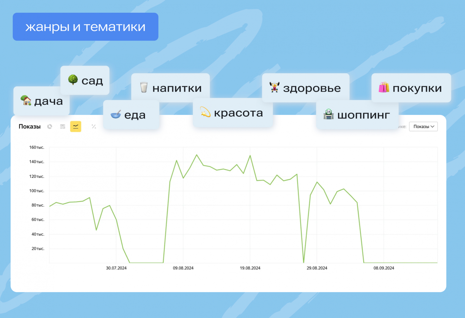 Если в поиске мы ловили пользователя в момент конкретного запроса, то здесь работали на интерес — показывали рекламу тем, кто уже листает сайты о кулинарии, ищет рецепты или обсуждает продукты