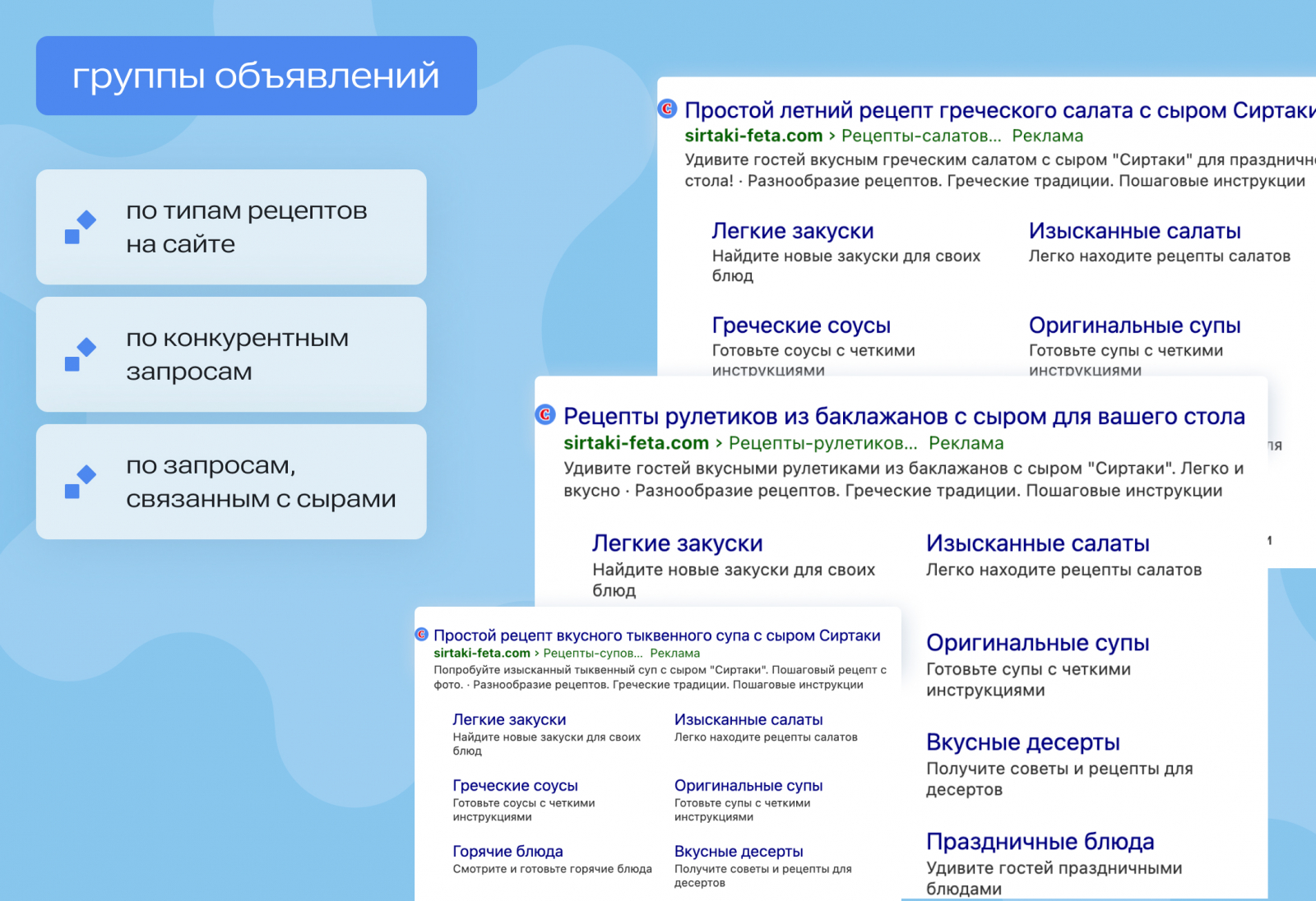 Собрали ключевые запросы под каждую страницу рецепта, создали уникальные рекламные объявления, которые давали пользователю именно то, что он искал. Для усиления проработали до 8 быстрых ссылок — все аккуратно, понятно и визуально привлекательно.