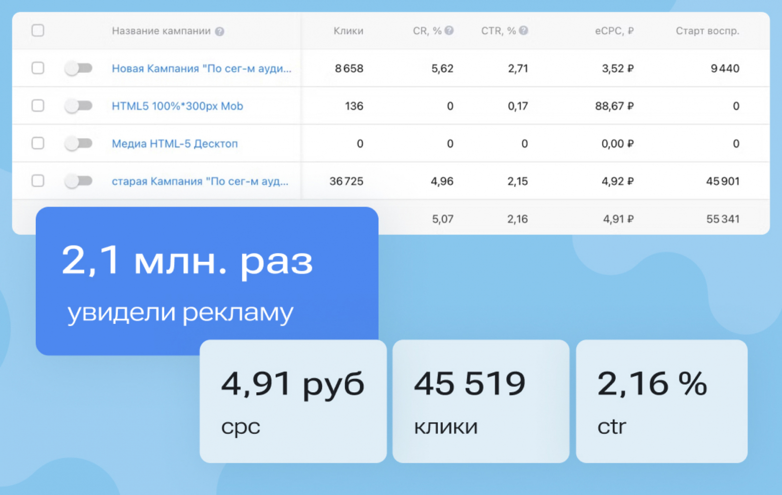 В итоге получили 4,5 млн показов и 80 тыс. кликов. Средняя стоимость перехода составила 7,5 руб, а CTR — 1,3%, что доказывает: объявления реально попадали в интересы пользователей.