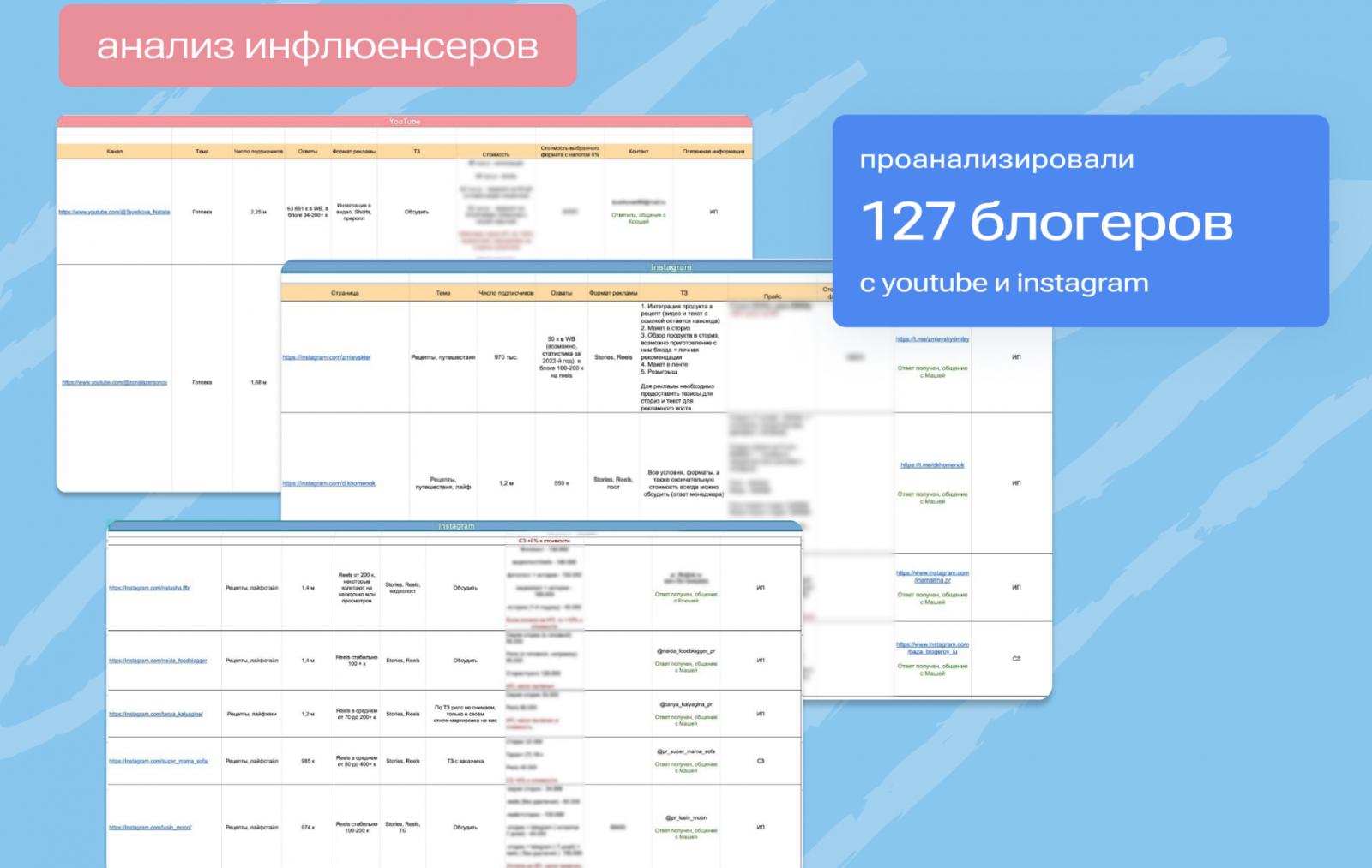 Дальше — ручная работа. Связались с каждым блогером, уточнили реальные охваты и стоимость размещения, потому что цифры в открытом доступе часто далеки от правды. Получив свежие данные, сузили список и согласовали финальный пул с заказчиком.