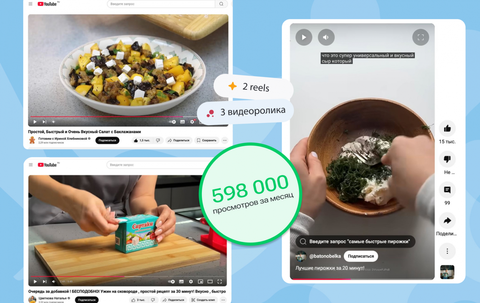Учли особенности каждой площадки и формат подачи: видеорецепты требуют четкой структуры и подачи, а шортс должны быть динамичными и цепляющими с первых секунд. Поэтому для каждого ролика мы проработали подробное ТЗ. В результате получили ряд аппетитных видеопубликаций, которые за месяц собрали почти 600 тысяч просмотров.