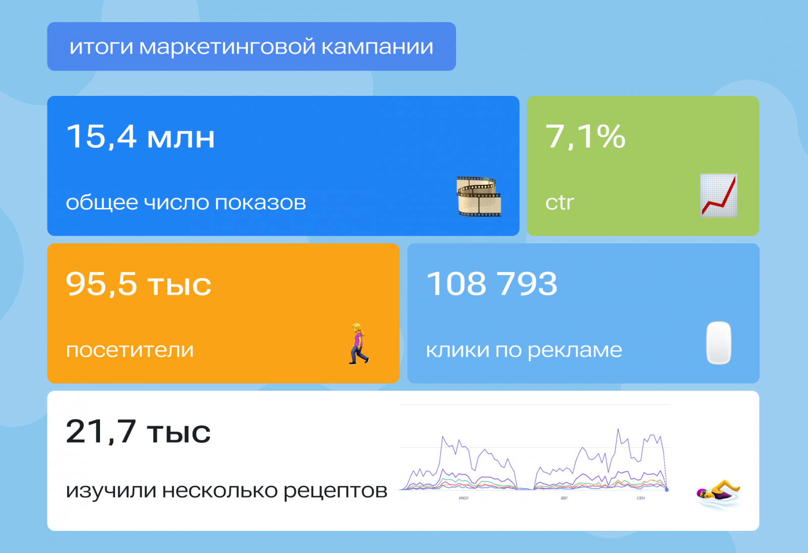 За все время в медийных кампаниях добились 7,2 миллионов показов: 5,6 млн — с кампании по интересам и жанрам, 1,6 млн — с профиля пользователей. Всего было 16 000 переходов и 5500 конверсий — это значит, что люди, незнакомые с брендом, перешли по рекламе и изучили рецепты на сайте. В итоге медийная реклама сработала как нужно: при относительно низких затратах мы смогли добиться больших охватов и привлечь новых пользователей.