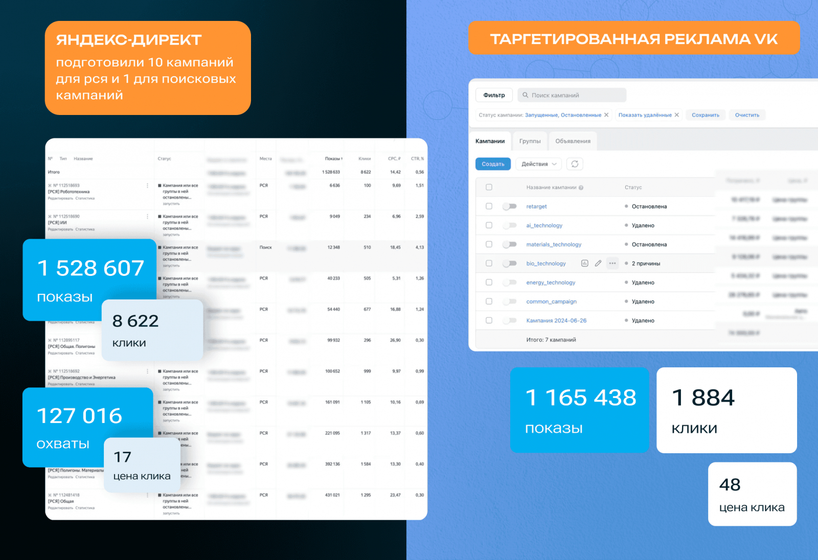 Контекстная реклама была настроена на 2 потока: поисковые кампании (для тех, кто активно искал конкурсы и гранты) и РСЯ (для формирования спроса среди потенциально заинтересованных пользователей).