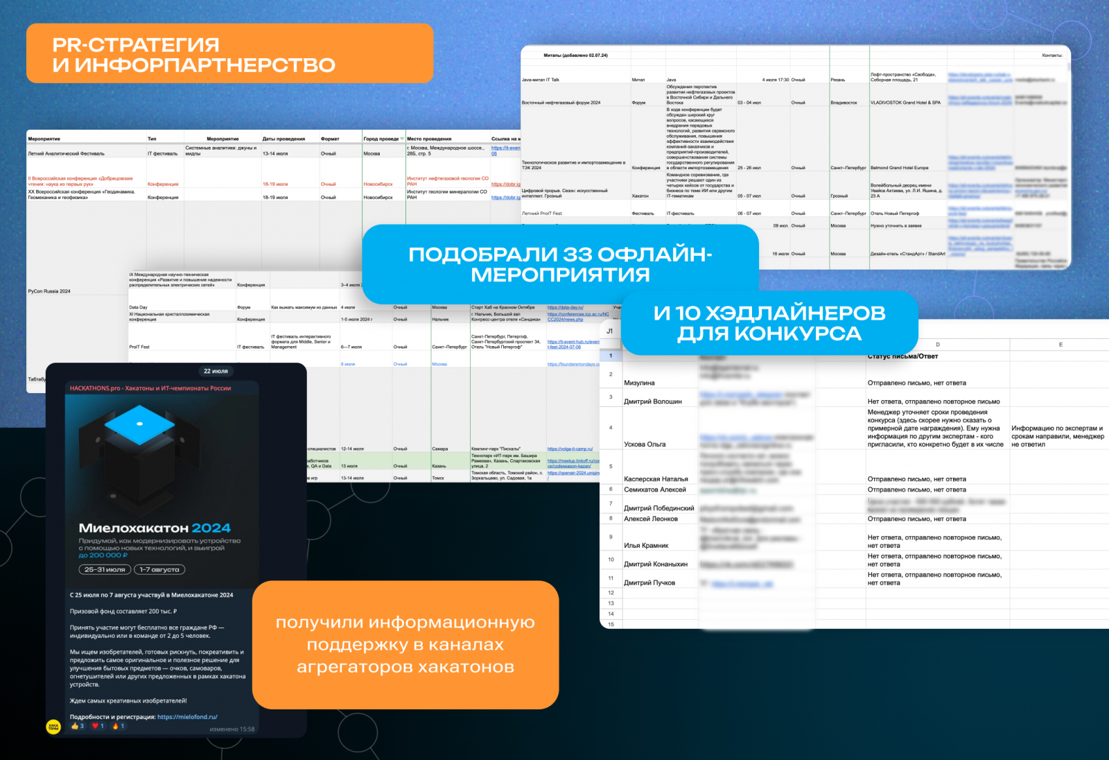 Дополнительно подбирали хедлайнеров из мира науки и технологий для конкурсного жюри. Общались с блогерами и общественными деятелями: предлагали сотрудничество, рассказывали о конкурсе, договаривались о публикациях и рекламе.