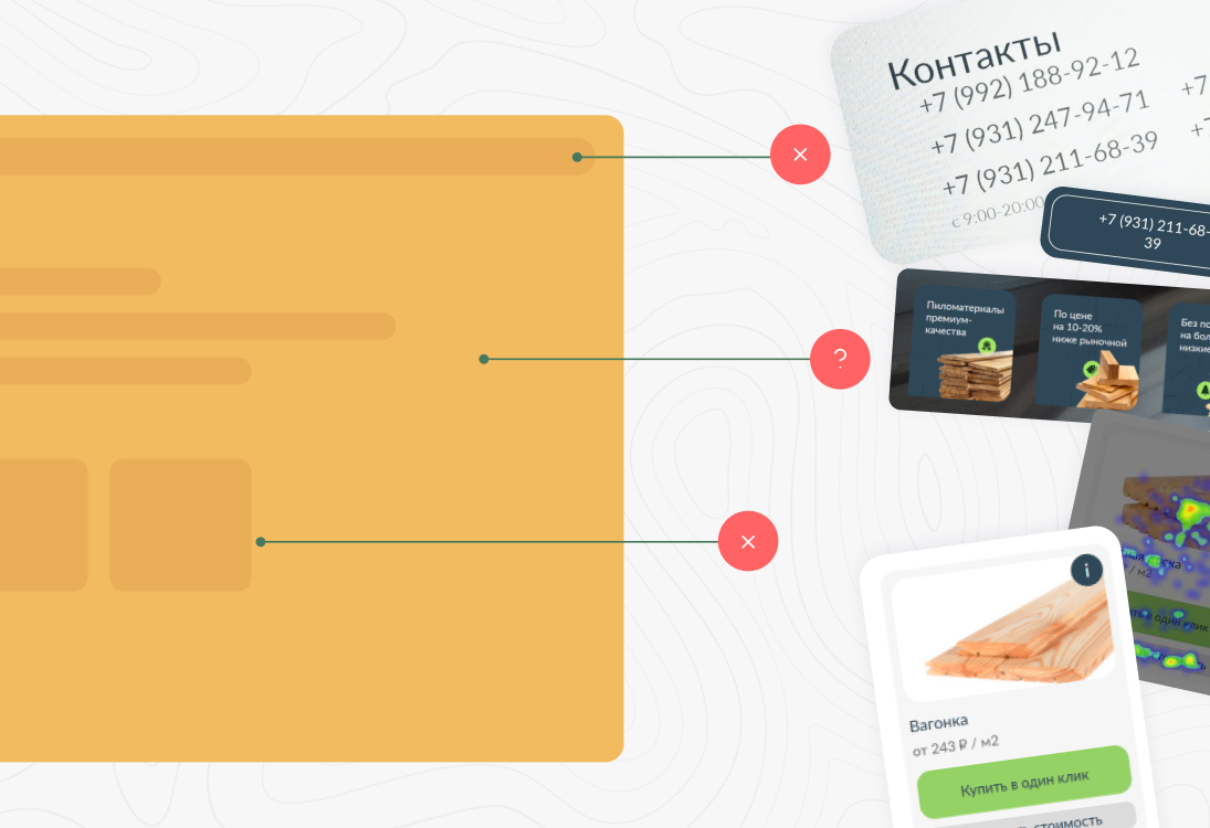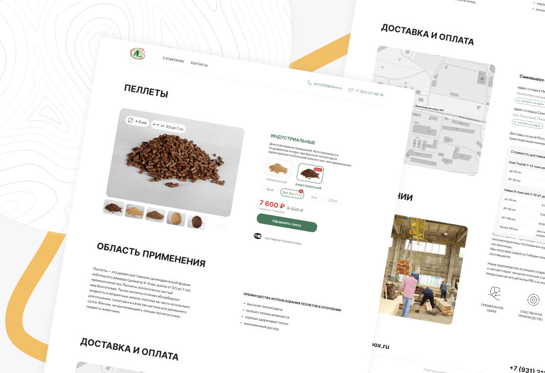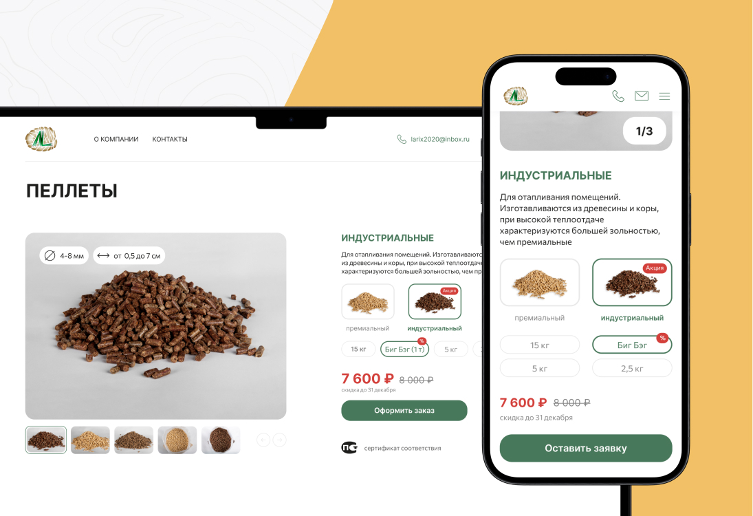 Трафик с рекламы нельзя было повторно направлять на старый сайт, потому что на главном экране пользователя встречал огромный заголовок «пиломатериалы из лиственницы», а сама карточка товара находилась в самом низу страницы и клиент попросту до неё не доходил, сбегая с сайта. Поэтому мы стали разрабатывать отдельную страницу под пеллеты.
