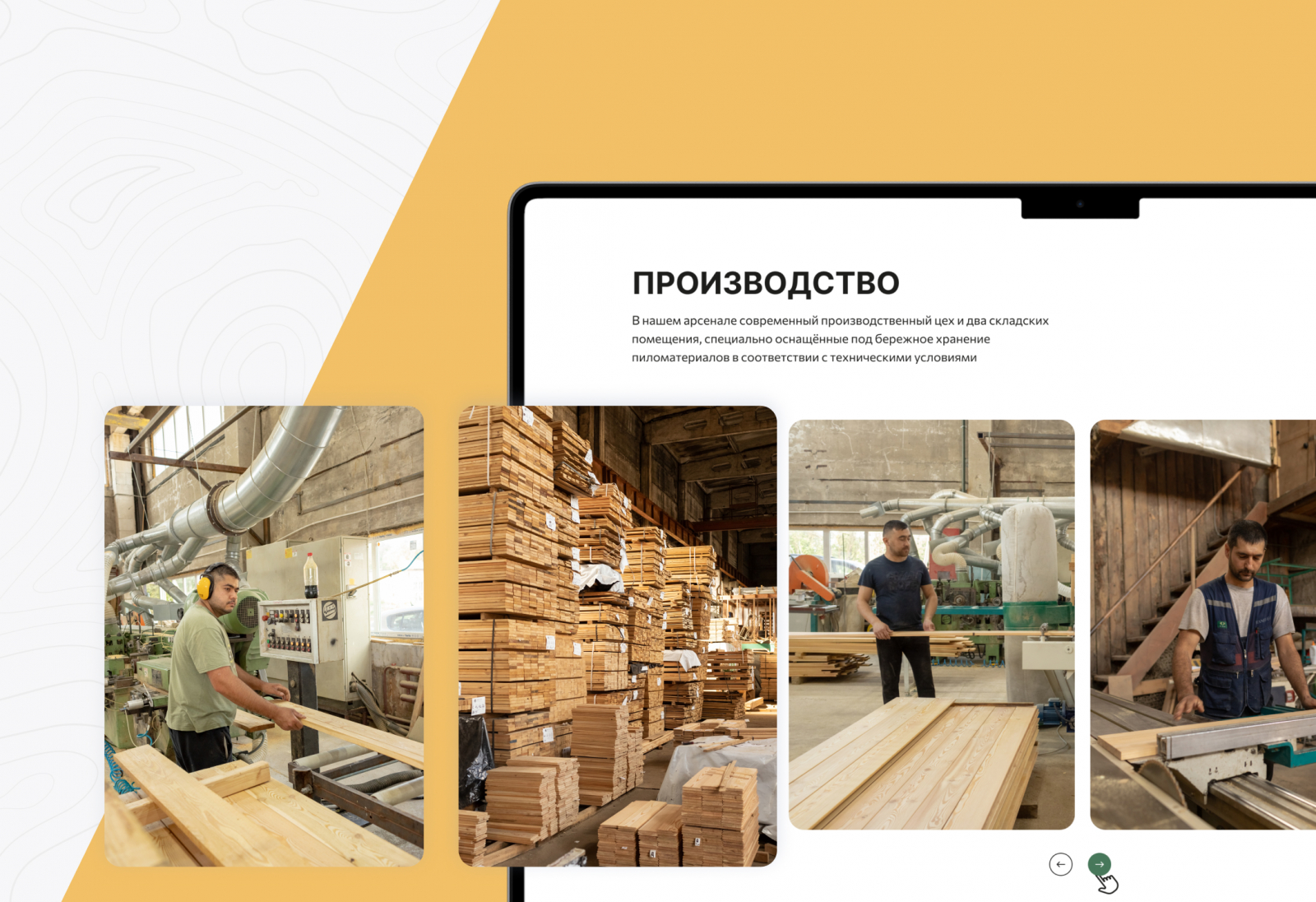 поэтому чётко попали в запрос аудитории, и погрузились в бизнес до того, что договорились с компанией о новой съёмке на производстве. Сделали много крутых фотографий и видео, использовали их в визуальной концепции и тем самым подчеркнули прозрачность работы, экологичность производства и качество пиломатериалов.