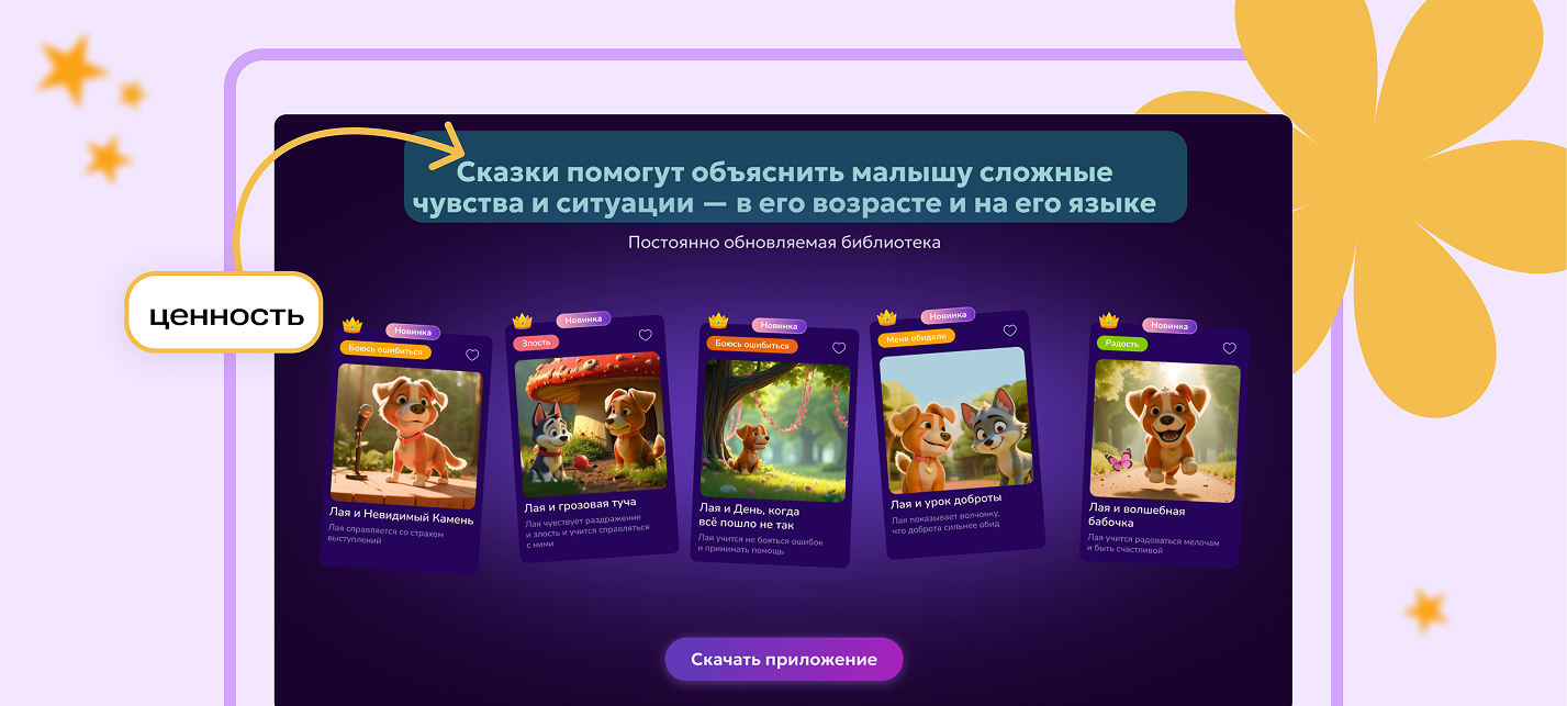 Из интервью мы поняли, что родителям важно занять ребёнка с пользой и найти такой досуг, который бы увлёк его и вызвал интерес к чтению. Всё это мы отразили в текстах и с делали акцент на конкретных вещах — например, многие родители говорили, что им при выборе книг — главного нашего конкурента — важны яркие иллюстрации.