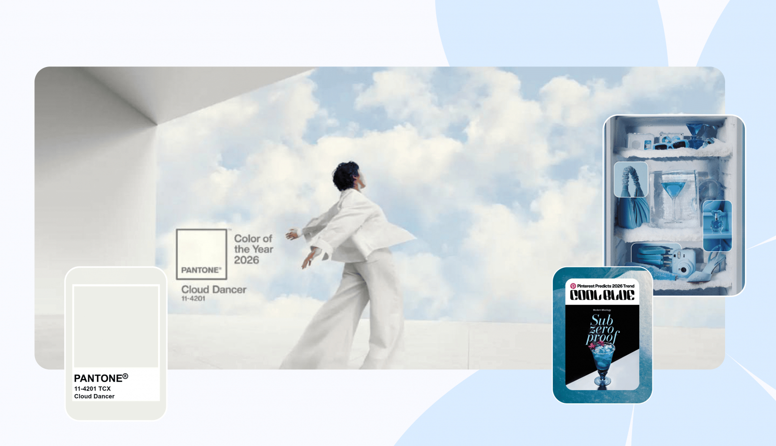 Pantone назвал цветом 2026 года Cloud Dancer — мягкий, нейтральный оттенок белого. В официальном описании Институт цвета связывает выбор с запросом на «перезапуск» и восстановление после затяжного периода неопределённости. Цвет в переводе — «шепот спокойствия в шумном мире». В социальных сетях и нашей беседе коллег цвет получил неофициальную интерпретацию, в связи с классическим цветом питерского неба, затянутого тучами. Параллельно Pinterest Predicts фиксирует рост интереса к холодной визуальной эстетике. Аудитория активно ищет и сохраняет образы, связанные с оттенками синего и «ледяными» текстурами.
