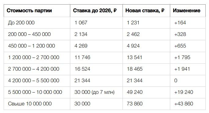 Новые ставки коснулись практически всех диапазонов стоимости партий. Особенно заметно изменилась верхняя граница шкалы: максимальный порог стоимости, при котором применяется единая ставка, вырос с 7 до 10 млн рублей. Для партий свыше этой суммы сбор теперь составит 73 860 рублей, что почти в 2,5 раза превышает прежнюю ставку в 30 000 рублей.