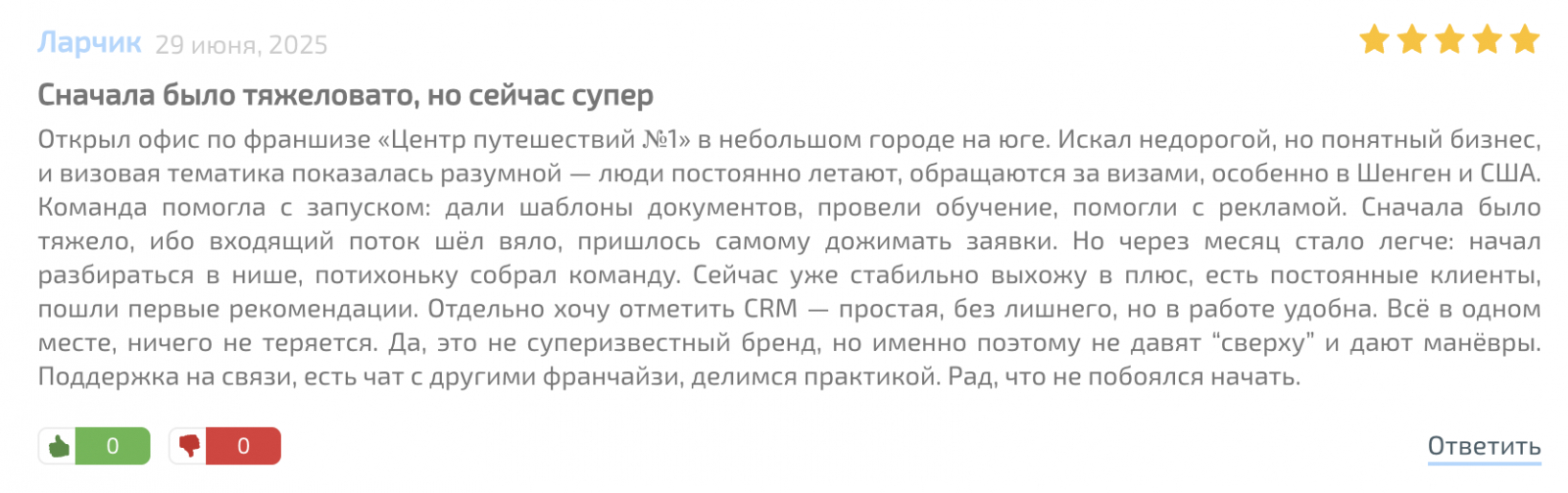 Мнение партнера положительное: «Всё функционирует согласно описанию. Предоставлены руководства и поддержка. Неприятных моментов не возникло. Объективные отзывы о франшизе, изученные перед покупкой, оказались правдивыми».