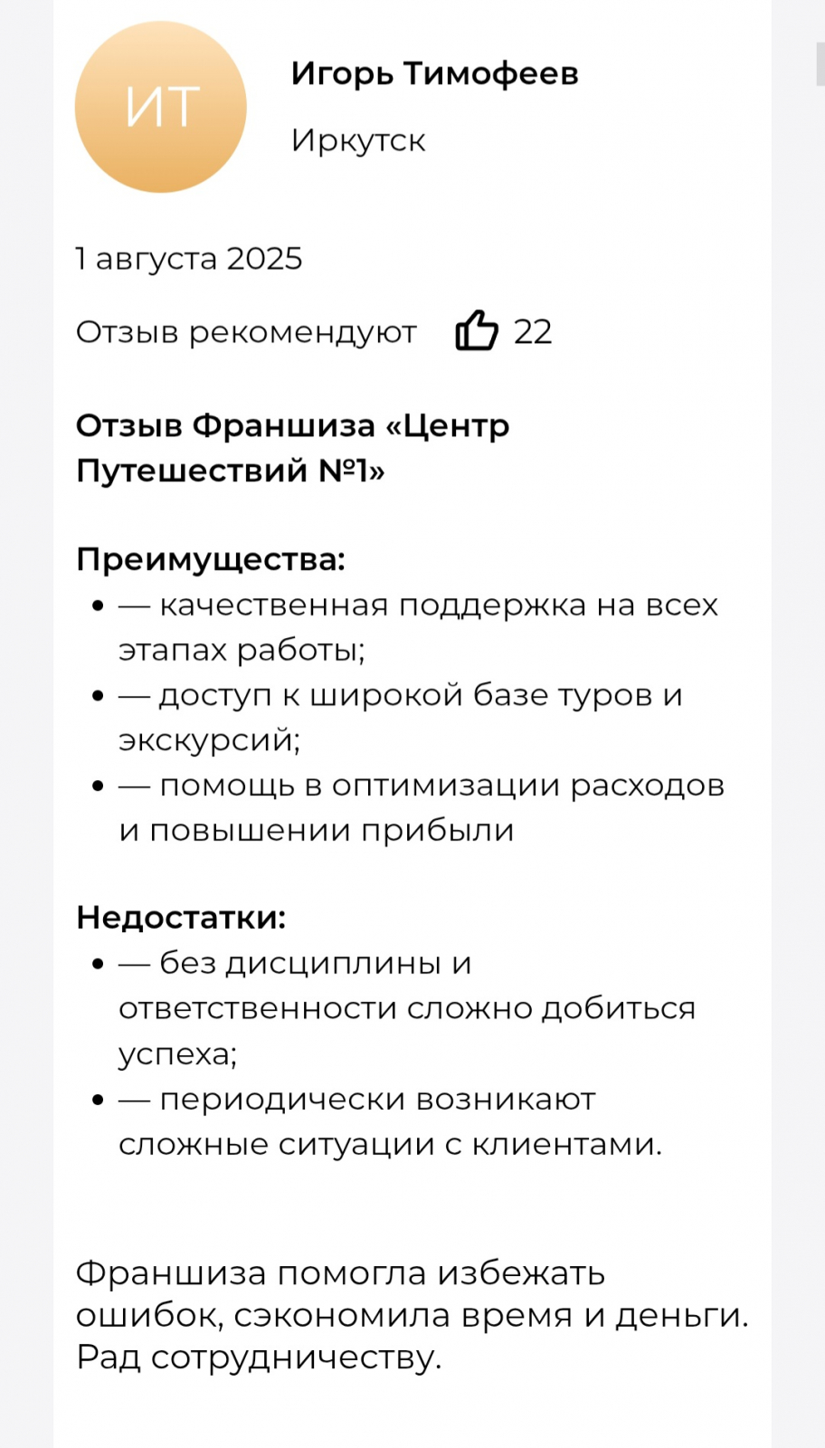 Больше подробностей и отзывы франчайзи доступны по ссылке: отзывы о франшизе Центр путешествий №1.