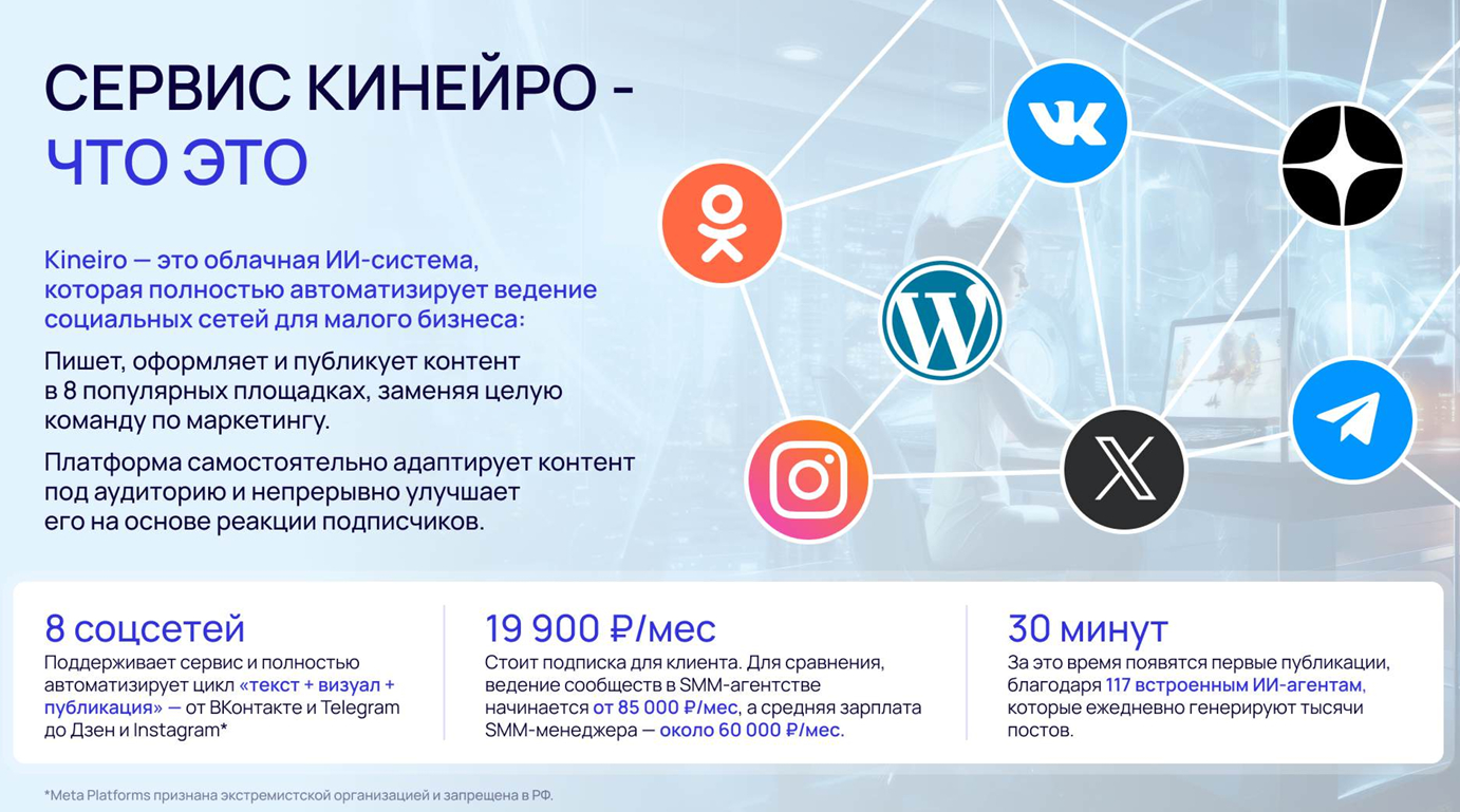 Стартовый взнос открывает доступ к готовой AI-платформе для автоматизации восьми соцсетей — ВКонтакте, Telegram, Яндекс.Дзен и других. Платформа сама генерирует контент, публикует посты, собирает аналитику и адаптирует материалы под аудиторию.