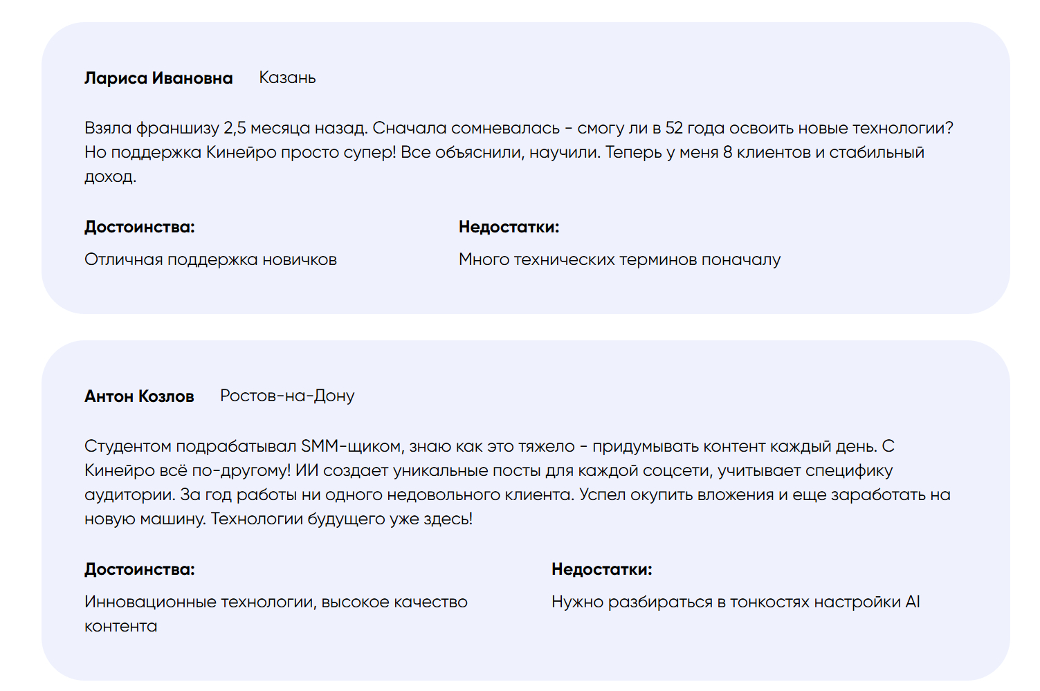 Мой вывод после анализа: франшиза Кинейро действительно работает и приносит стабильный доход, но она подходит не для пассивного инвестирования, а для тех, кто готов активно участвовать в бизнесе. Отзывы показывают, что успех зависит от вовлеченности франчайзи, готовности учиться и применять цифровые инструменты на практике. Одновременно цифровая модель минимизирует территориальные ограничения и позволяет масштабироваться даже в малых городах, что делает франшизу особенно интересной для предпринимателей, ищущих перспективный IT-бизнес с минимальными физическими затратами.