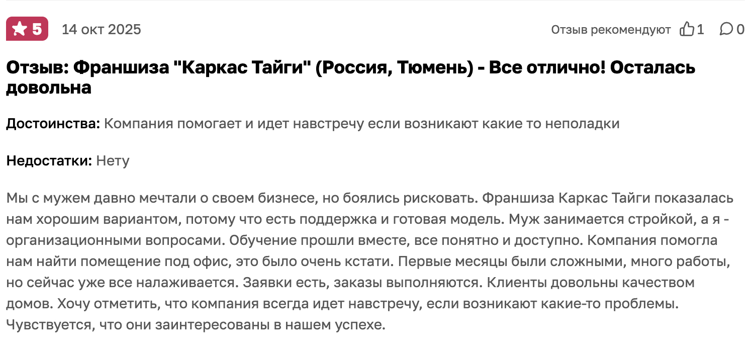 Отзывы о «Каркас Тайги» полярные. Одни партнёры называют франшизу «рабочей схемой с живыми клиентами», другие — «конструктором, где всё зависит от тебя». Среди положительных моментов чаще всего упоминают прозрачность бизнес-модели, готовые инструменты и отсутствие жёстких роялти. Из минусов — дефицит кадров, задержки поставок и необходимость самому искать заказы.